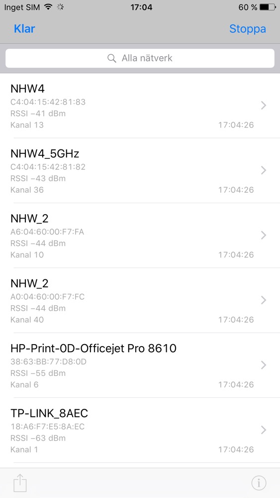 Om du vill göra samma sak i iOS är det lite krångligare. Sök först efter ”Airport” i App Store och ladda ner ”Airport-verktyg” från Apple. Gå till Inställningar och öppna fliken för Airport. Aktivera Wi-Fi-sökare och öppna Airport-appen. Klicka på ”Wi-Fi-sökning” längst upp till höger. Nu visas en lista över alla nätverk i närheten samt deras respektive kanal. Nätverk som listas med ett kanalnummer under 15 använder 2,4 GHz-bandet och kanaler över 35 använder 5 GHz-bandet.
