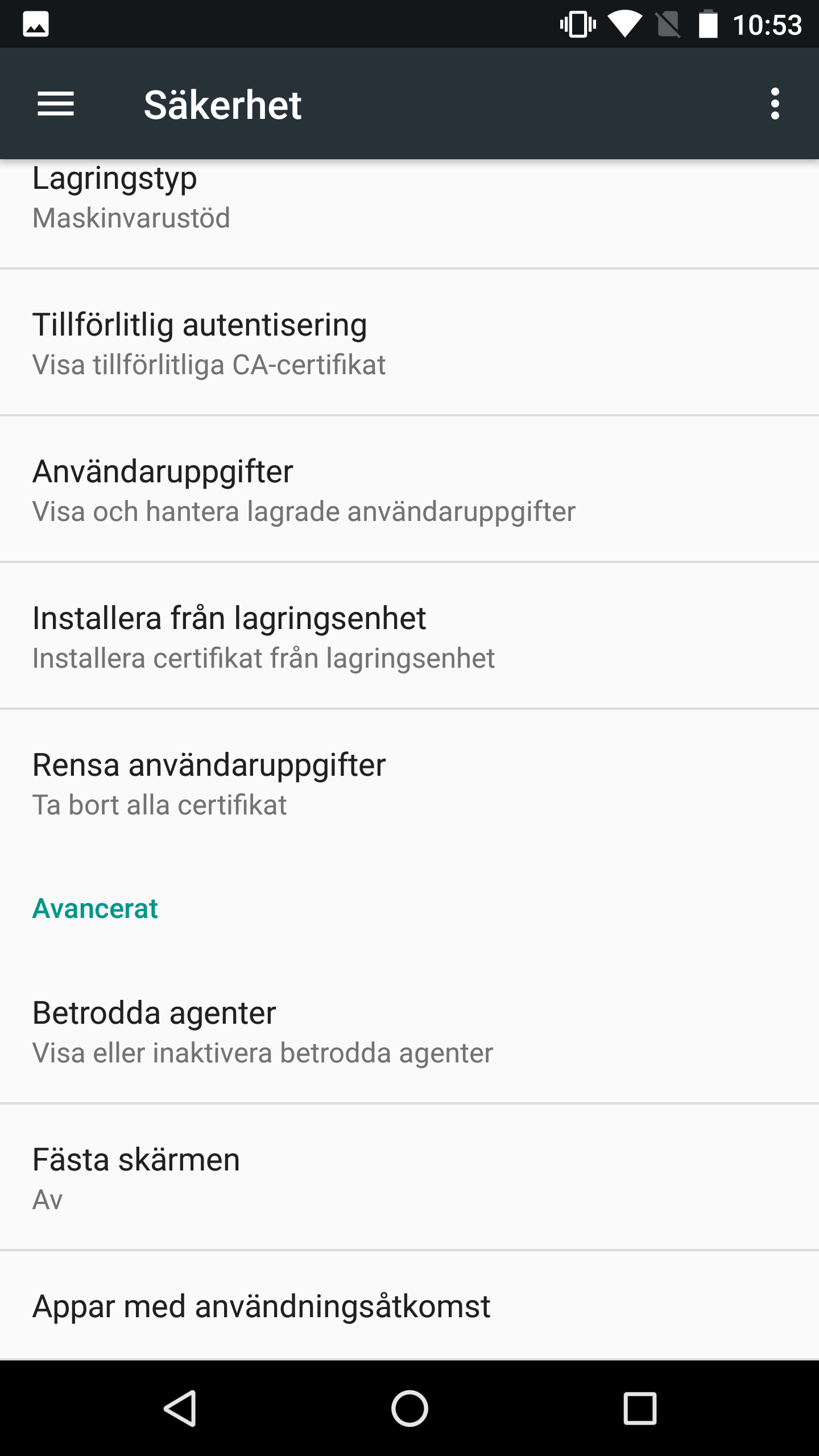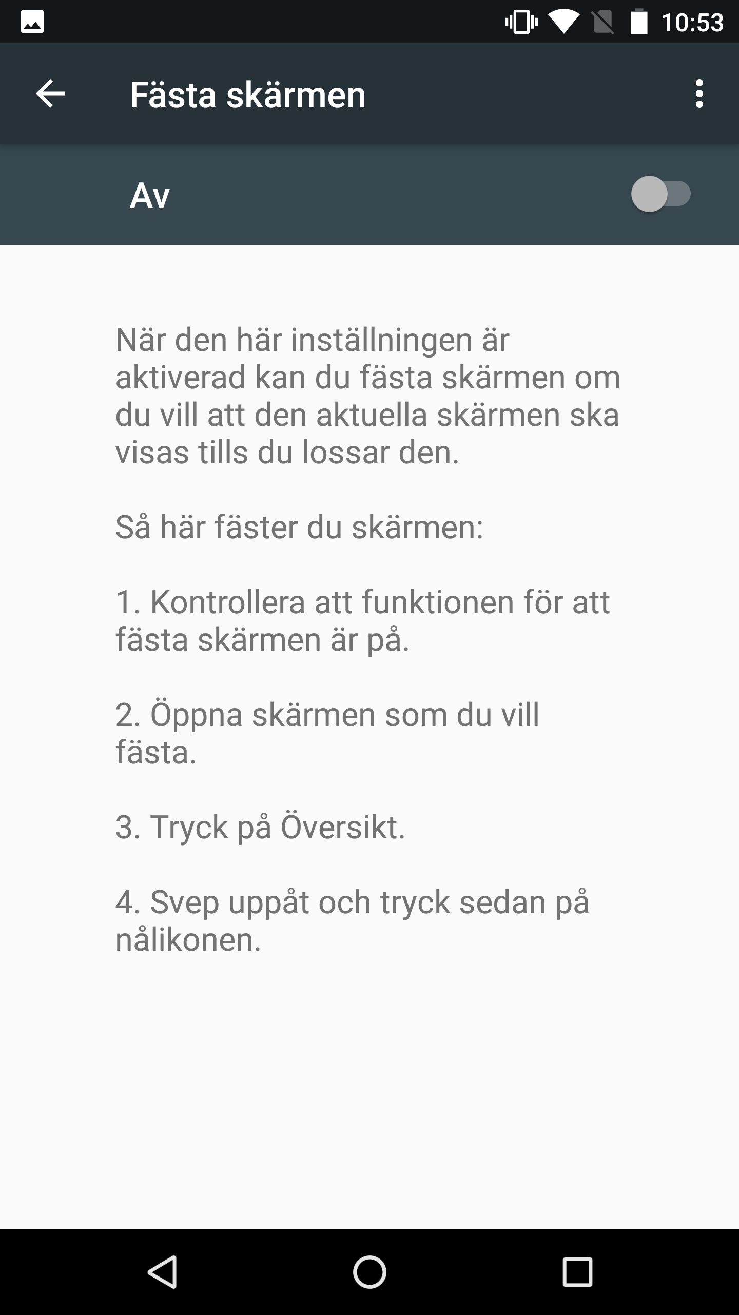 När Fästa skärmen-funktionen är aktiverad kan du låna ut din telefon. Personen som lånar telefonen kan nu bara använda den app som du fäste. För att komma åt andra appar håller du ner tilllbaka-knappen i mer än en sekund och därefter låser du upp telefonen med en PIN-kod eller ett fingeravtryck.