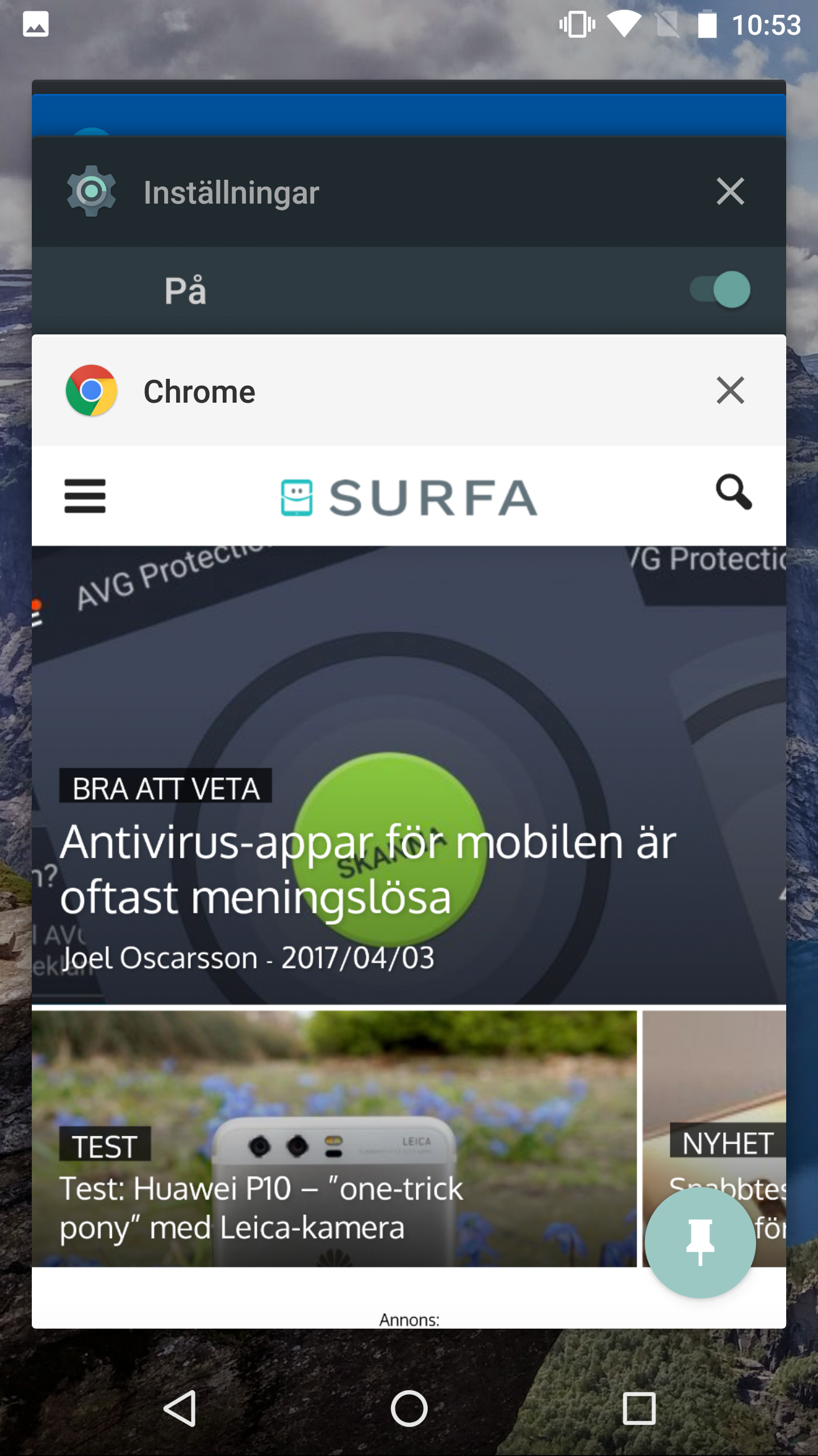 Nu har vi aktiverat Fästa skärmen-funktionen. För att komma igång med funktionen börjar vi med att öppna den app som vi vill dela. När vi har öppnat appen klickar vi på knappen för applikationsbytaren. På de flesta telefoner är den en fyrkantig ikon längst ner till höger men på Samsung-mobiler sitter den längst ner till vänster. Vi bläddrar ner på sidan så att vi ser hela kortet för appen vi just hade öppen. Nu ska det finns ett häftstift längst ner till höger. Klicka på det. Nu bör du få ett meddelande på skärmen som säger att skärmen är fäst. Om du klickar på hemknappen ska telefonen vägra gå till hemskärmen.