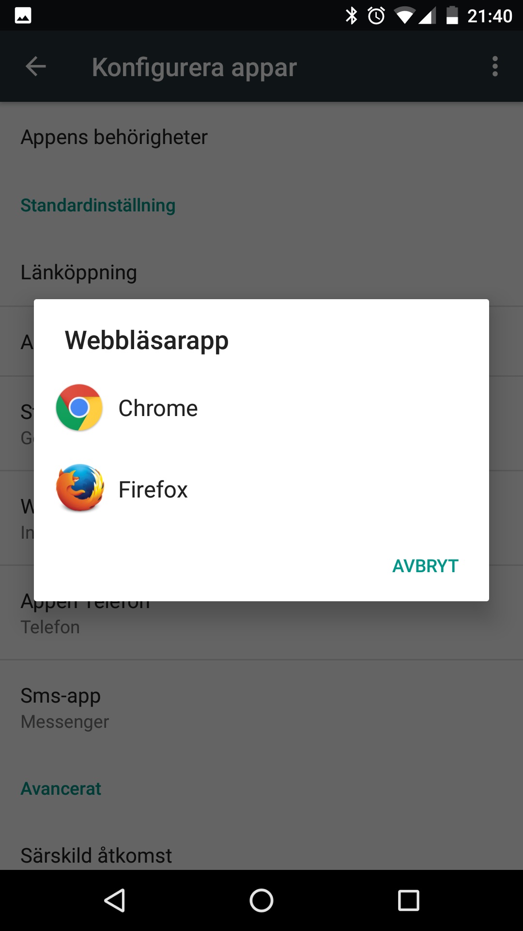 Öppna först inställningsmenyn genom att dra ner från toppen av skärmen och tryck på det lilla kugghjulet längst upp till höger. Bläddra sedan ner på skärmen och tryck på Appar. Tryck nu en gång till på kugghjulet uppe i det högra hörnet för att komma in i menyn som heter Konfigurera appar. Där finns en knapp som heter Webbläsarapp, tryck på den och välj sedan vilken webbläsarapp som ska användas som standard. I vissa telefoner kan du först behöva trycka på ett alternativ som heter Standardapp innan du kan välja Webbläsarapp.
