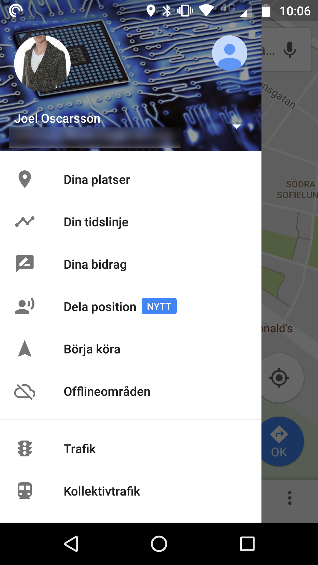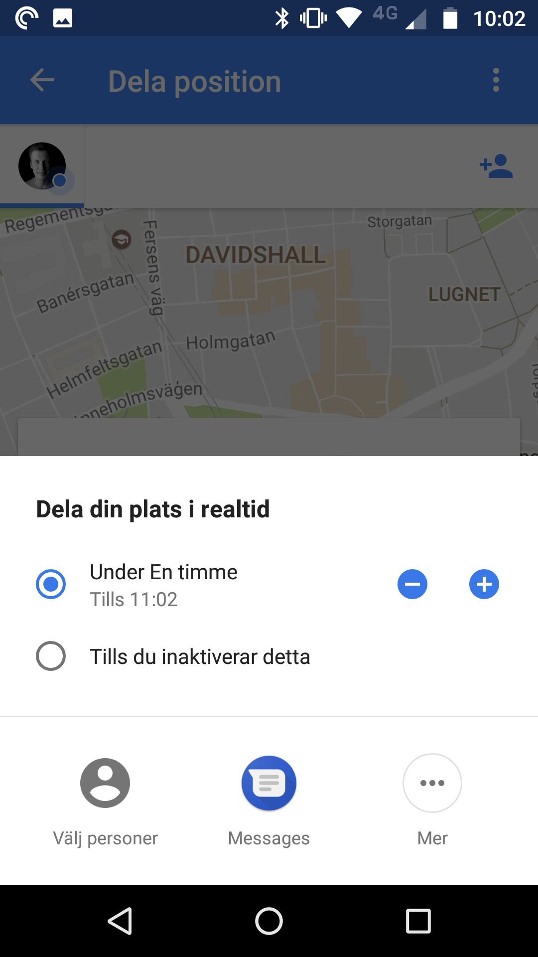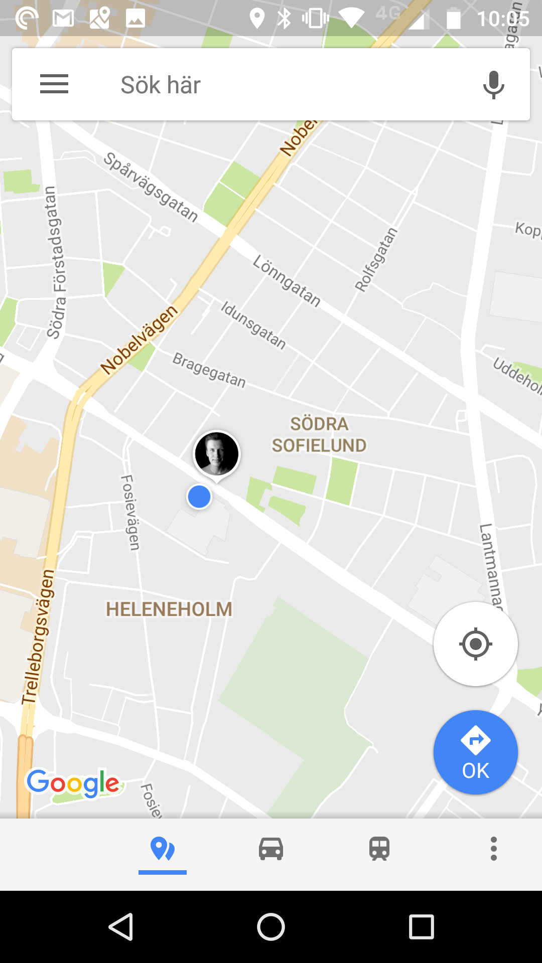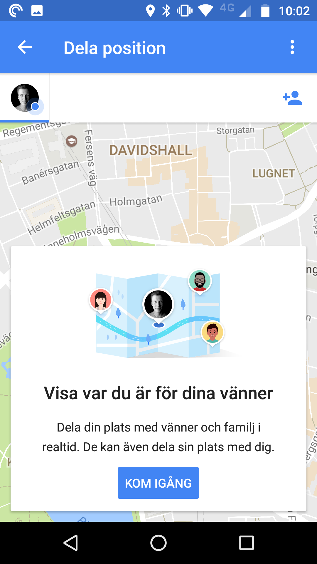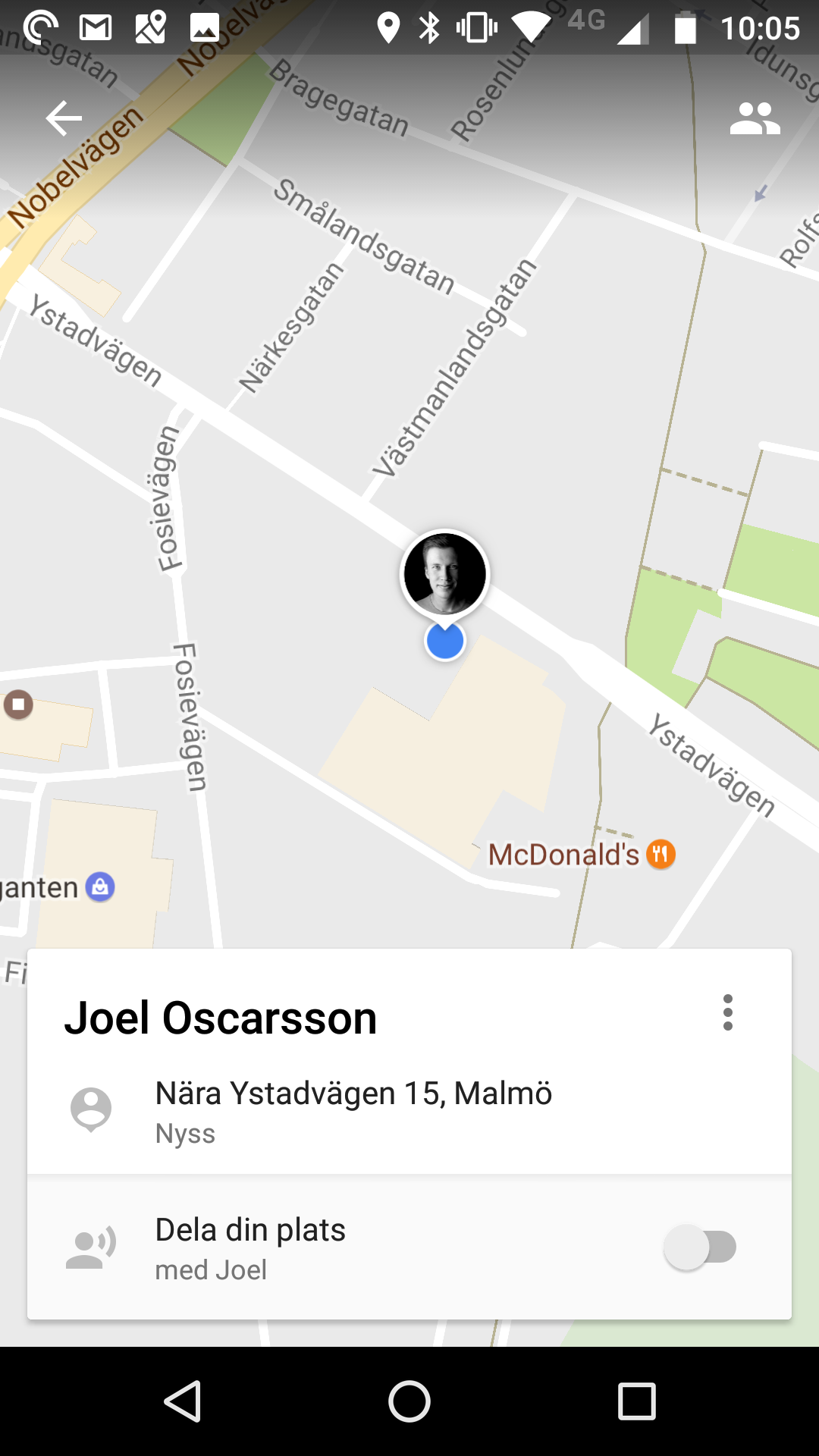 Om någon har delat sin position med dig och du har ett Google Maps-konto kan du alltså se den personens position i Google Maps-appen. Du ser då personens bild på kartan. Du kan klicka på personen för att se adressen där personen befinner sig just nu och navigera till den platsen. Du kan också dela din position med personen genom att klicka på personens ikon och sedan på ”Dela din plats” som dyker upp i menyn längst ner på skärmen.