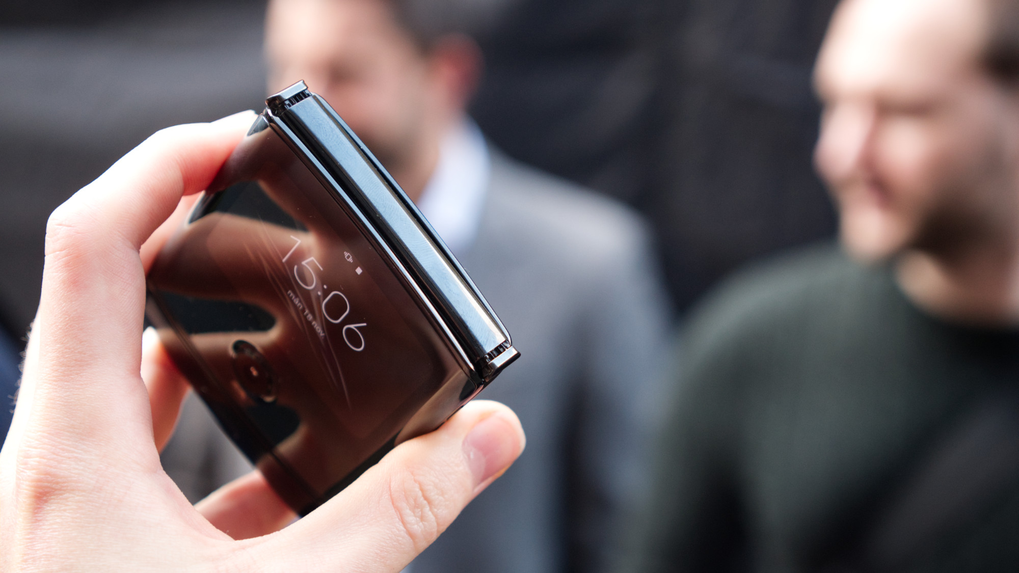 Designen är verkligen speciell. Den har många intressanta detaljer som inte nödvändigtvis är uppenbara till en början. För det första noterar vi hur platt skärmen ser ut när den är uppvikt. Motorola påpekar att det bland annat beror på ett gångjärn som består av rostfritt stål, ett ovanligt materialval för smartphones. Gångjärnet pressar delvis ner skärmen i den speciella hakan av telefonen när den viks ihop. Det gör att den kan streckas ut och hållas rak när den viks ut. En annan detalj kring den vikbara designen är faktumet att de två halvorna av skärmen vilar tätt mot varandra när den är stängd. Det betyder att det finns ett relativt litet utrymme för smuts att komma in. Vi ser samtidigt att det finns små förhöjningar som ser till att skärmen inte tar skada när den stängs.