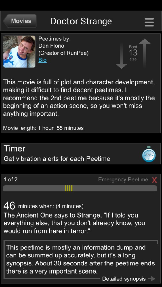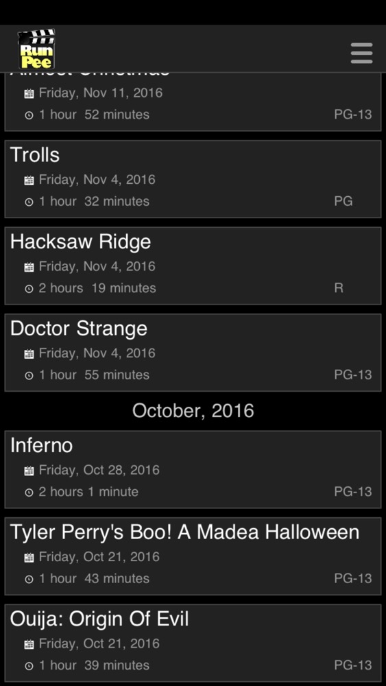 När man går på bio är det svårt att pausa filmen för en kisspaus. Med RunPee kan du sätta igång appen när filmen börjar och få en vibration i fickan när filmen bäst lämpar sig för en kisspaus. Redaktörer har kollat igenom alla stora filmer som släpps på bio och valt de mest ointressanta delarna av filmen. På det sättet kan du springa iväg i några minuter och missa så lite som möjligt. På vägen tillbaka från toaletten kan du till och med läsa en kort beskrivning av vad du missade.