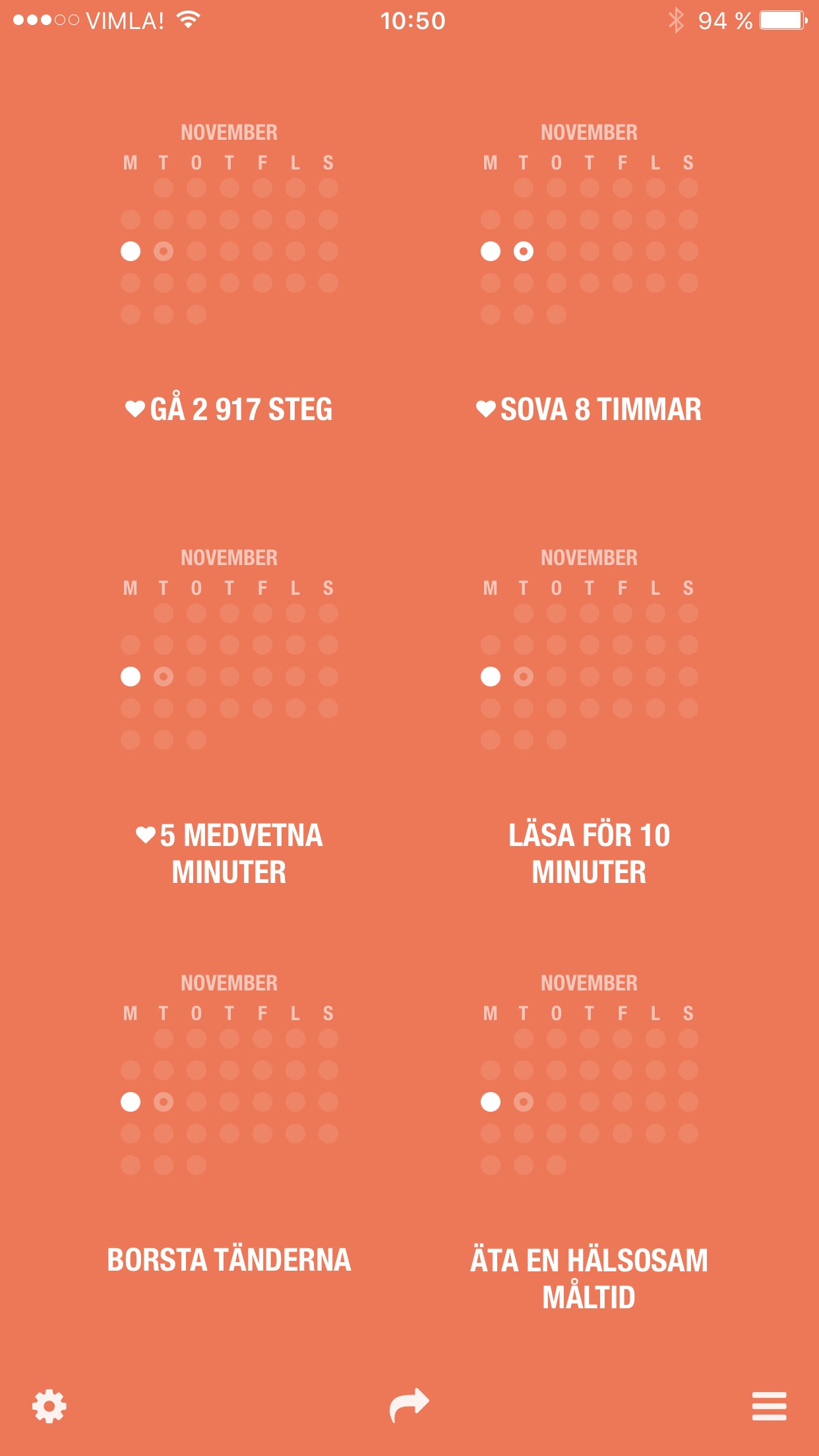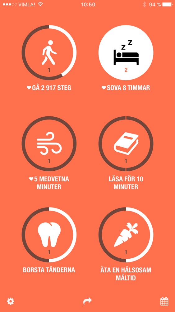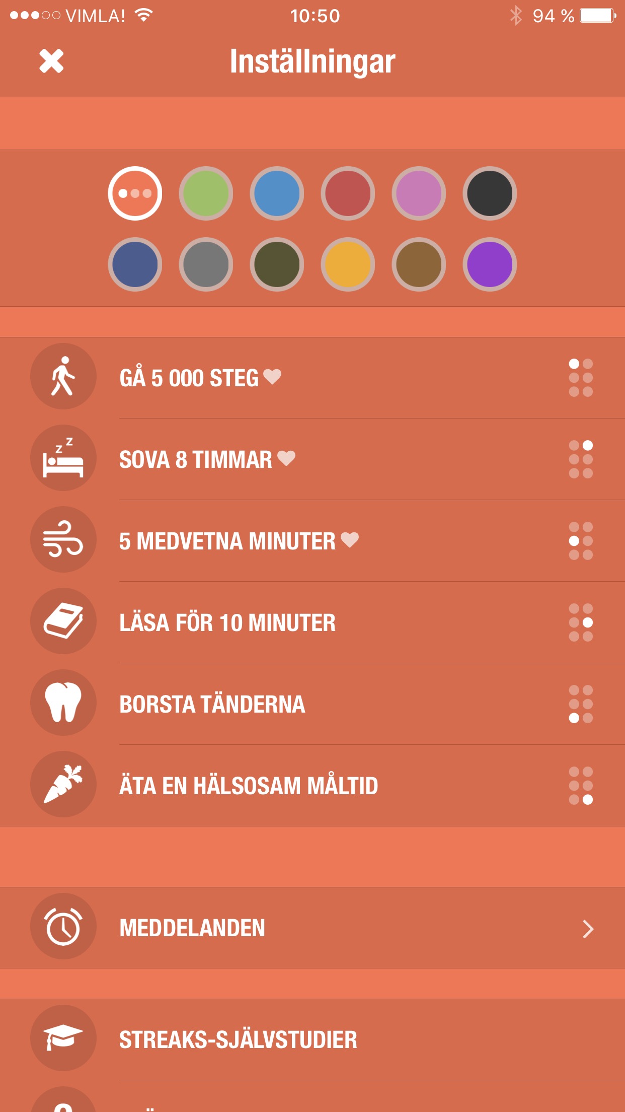 Det kan vara svårt att hålla uppe goda vanor. Med Streaks kan du göra dina goda vanor till en utmaning. Berätta för appen vilka saker du vill göra varje dag och försök hålla upp en så lång streak som möjligt. Desto fler dagar du gör alla dina goda vanor i rad, desto längre streak får du. Om du missar en dag börjar du om från noll.