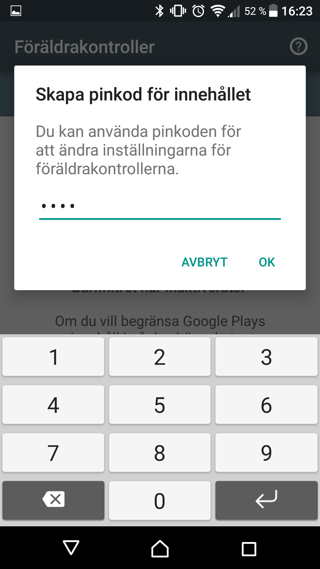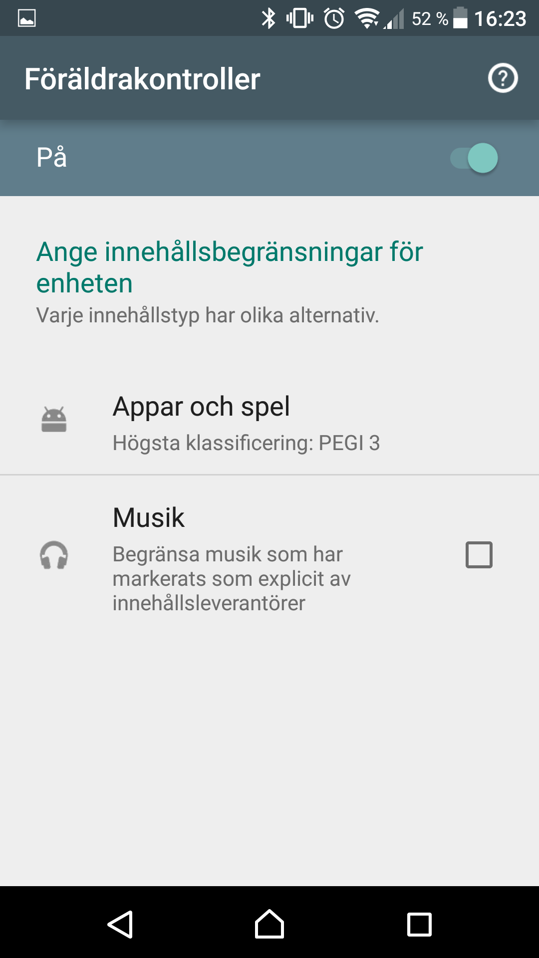Du kan aktivera ett skydd så att barn inte ser opassande innehåll i Google Play Store. Klicka på hamburgerknappen längst upp till vänster. Bläddra ner och klicka på Inställningar. Klicka sedan på Föräldrakontroller under Användarkontroller. Här kan du aktivera skyddet, bestämma vilken ålderklassning som innehåll får ha och om musik som är markerat som explicit får visas. När skyddet aktiveras får föräldern välja en PIN-kod som måste användas för att stänga av skyddet.