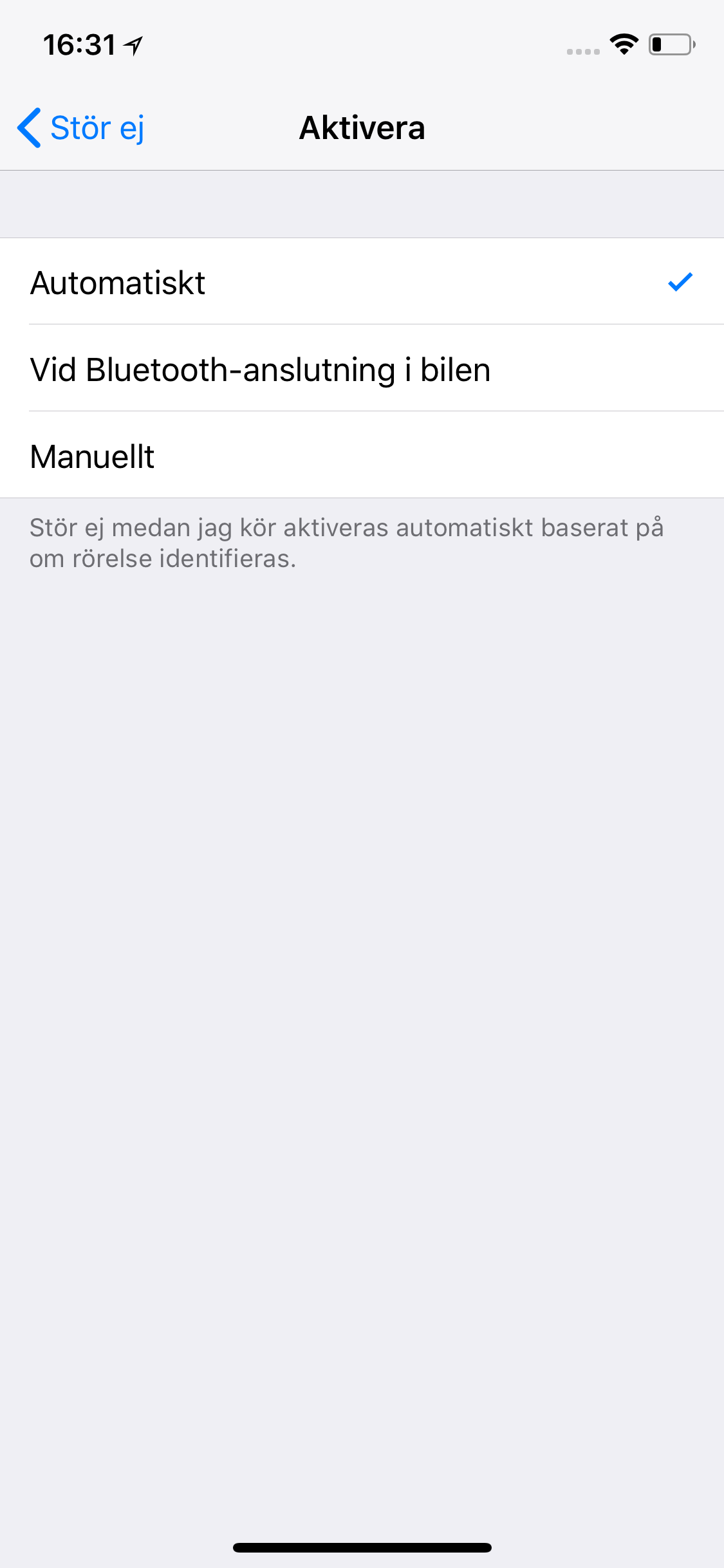 Om du inte har Bluetooth i din bil kan du använda det automatiska läget. Det använder din telefons rörelsesensor samt data om hur ofta telefonen byter mellan olika telemaster för att automatiskt lista ut om du kör en bil. Den tar därför lite längre tid att aktiveras än Bluetooth-alternativet. När det är aktiverat fungerar det dock på exakt samma sätt.