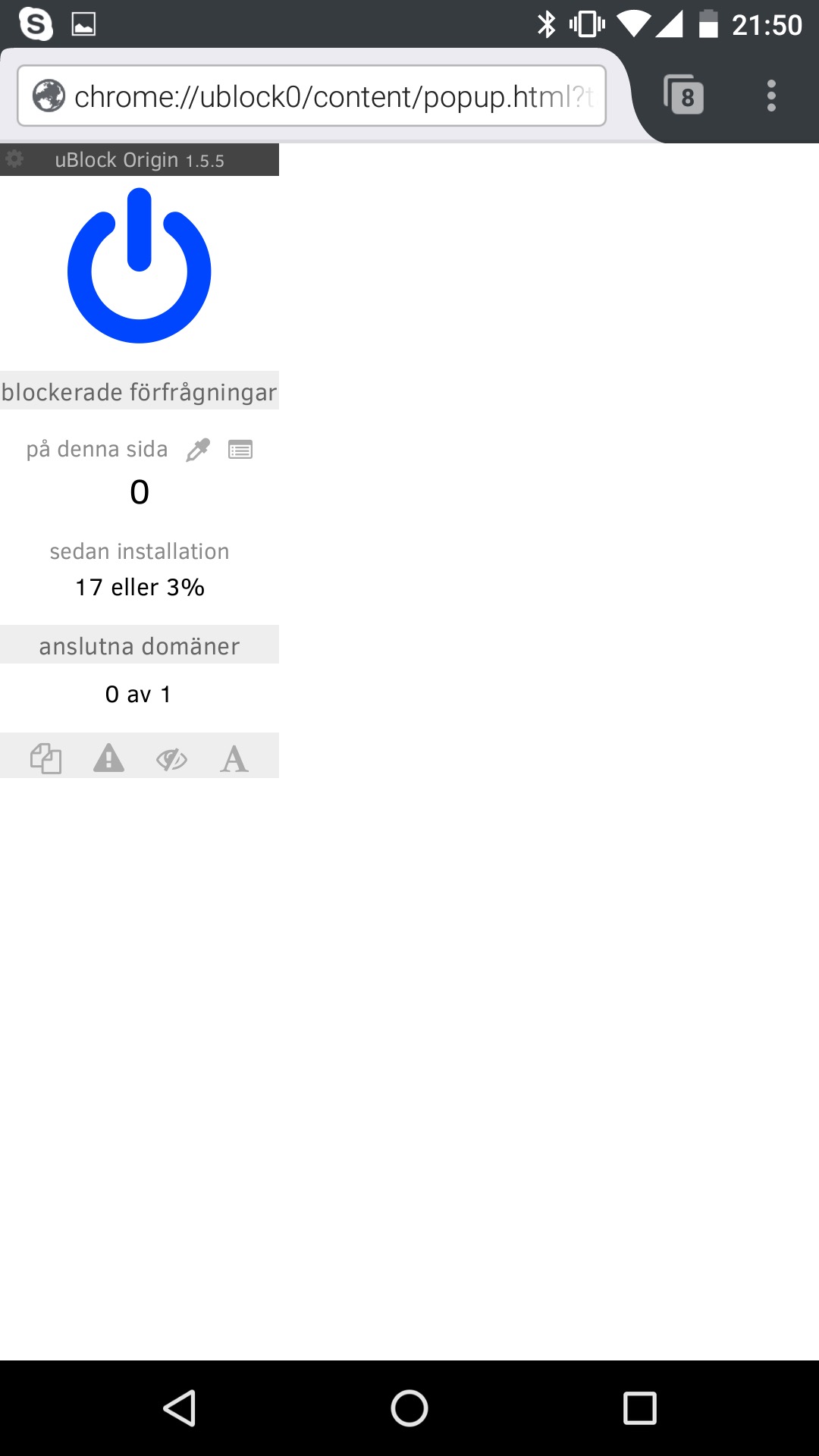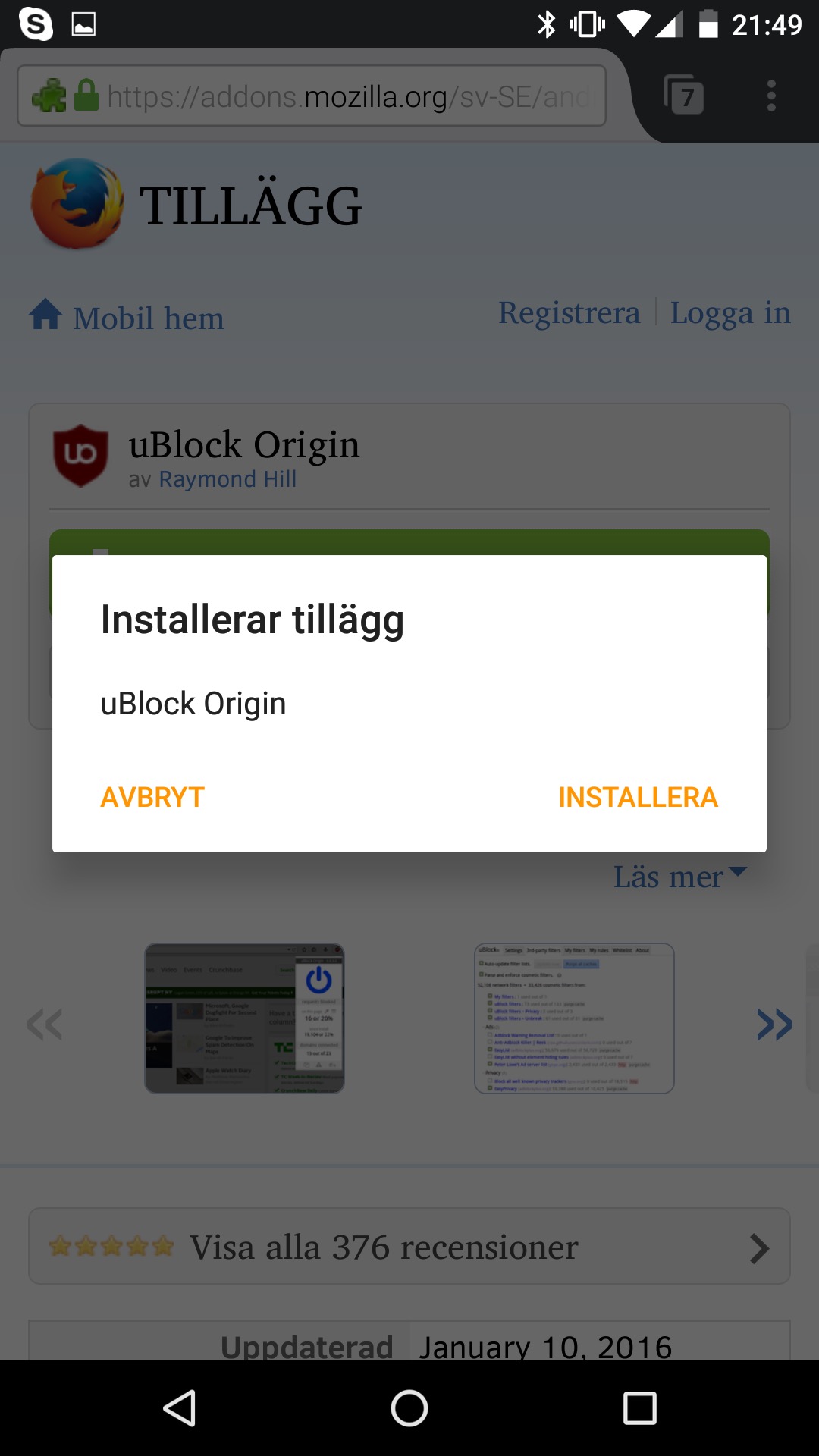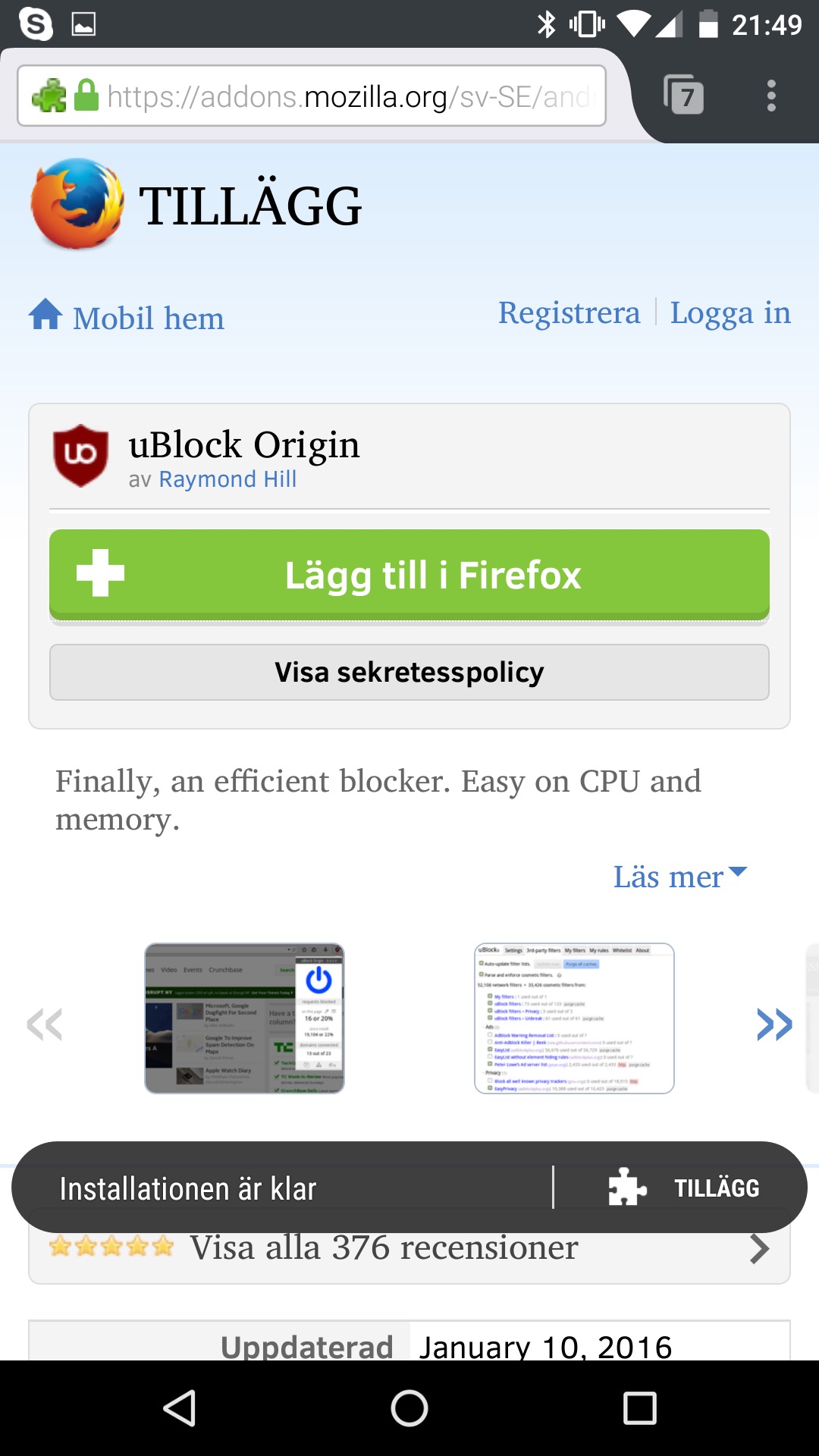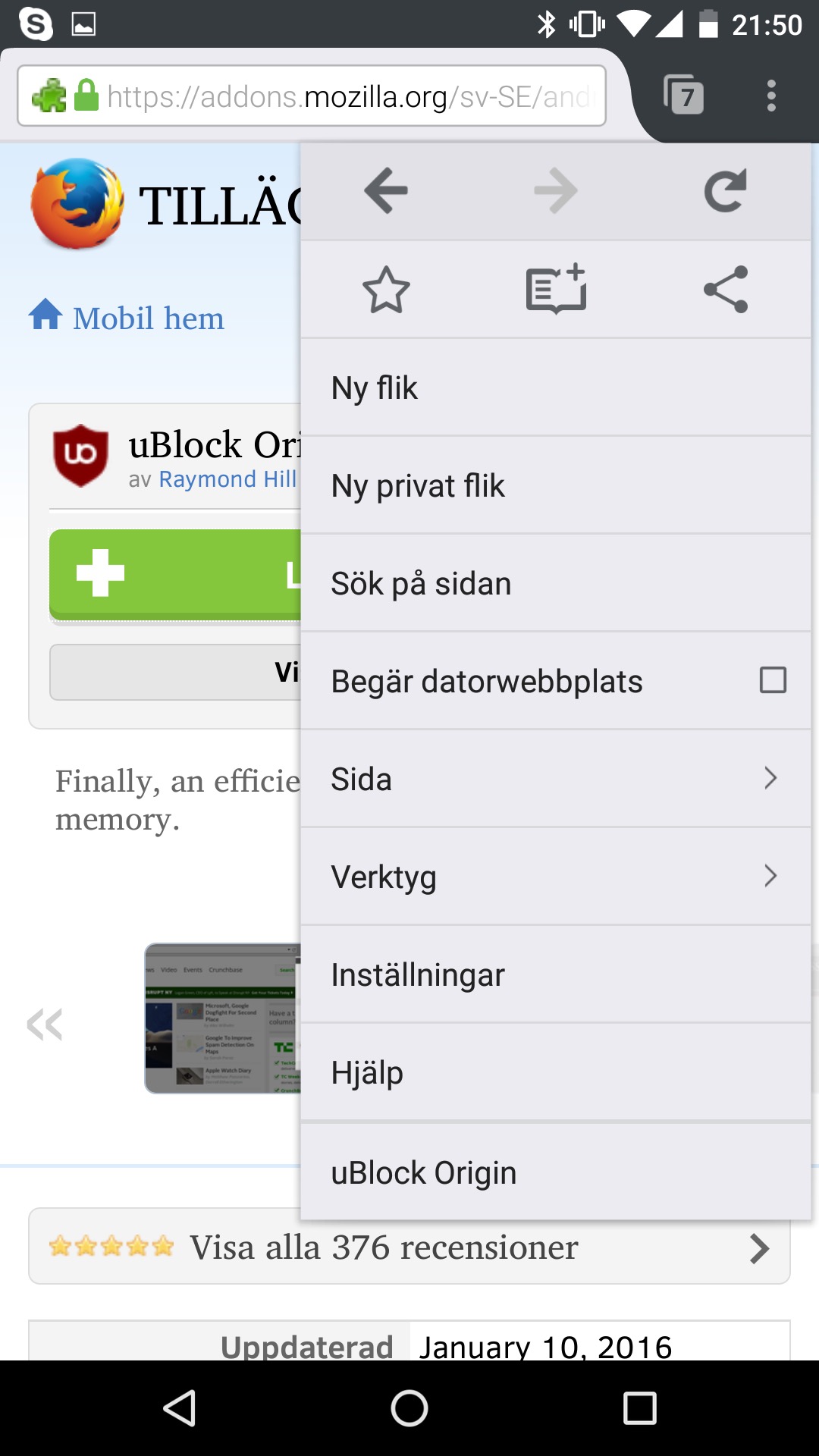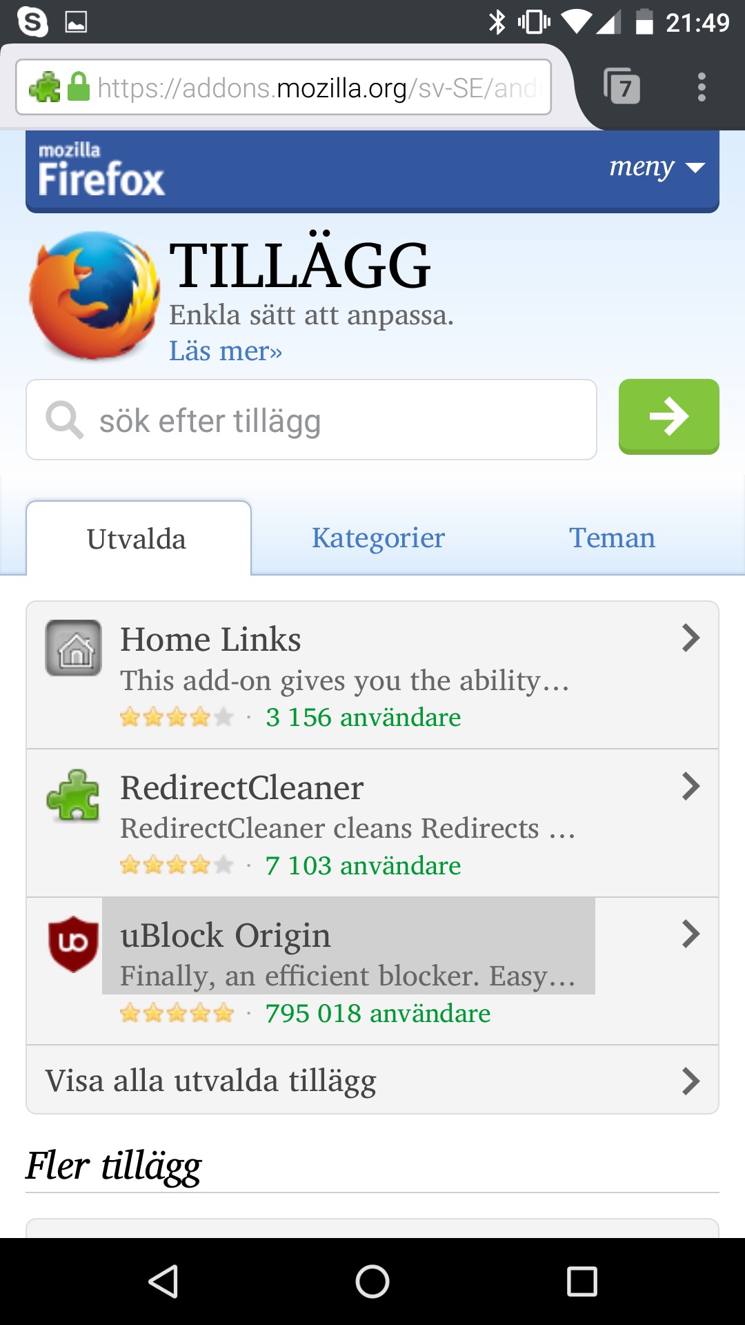 Många tillägg fungerar i mobilen men är inte nödvändigtvis helt anpassade för din lilla mobiltelefons skärm. De fungerar oftast bra men kan se lite konstiga ut. I bilderna nedan installerar vi exempelvis Ublock Origin som fungerar bra men som ser lite konstig ut.
