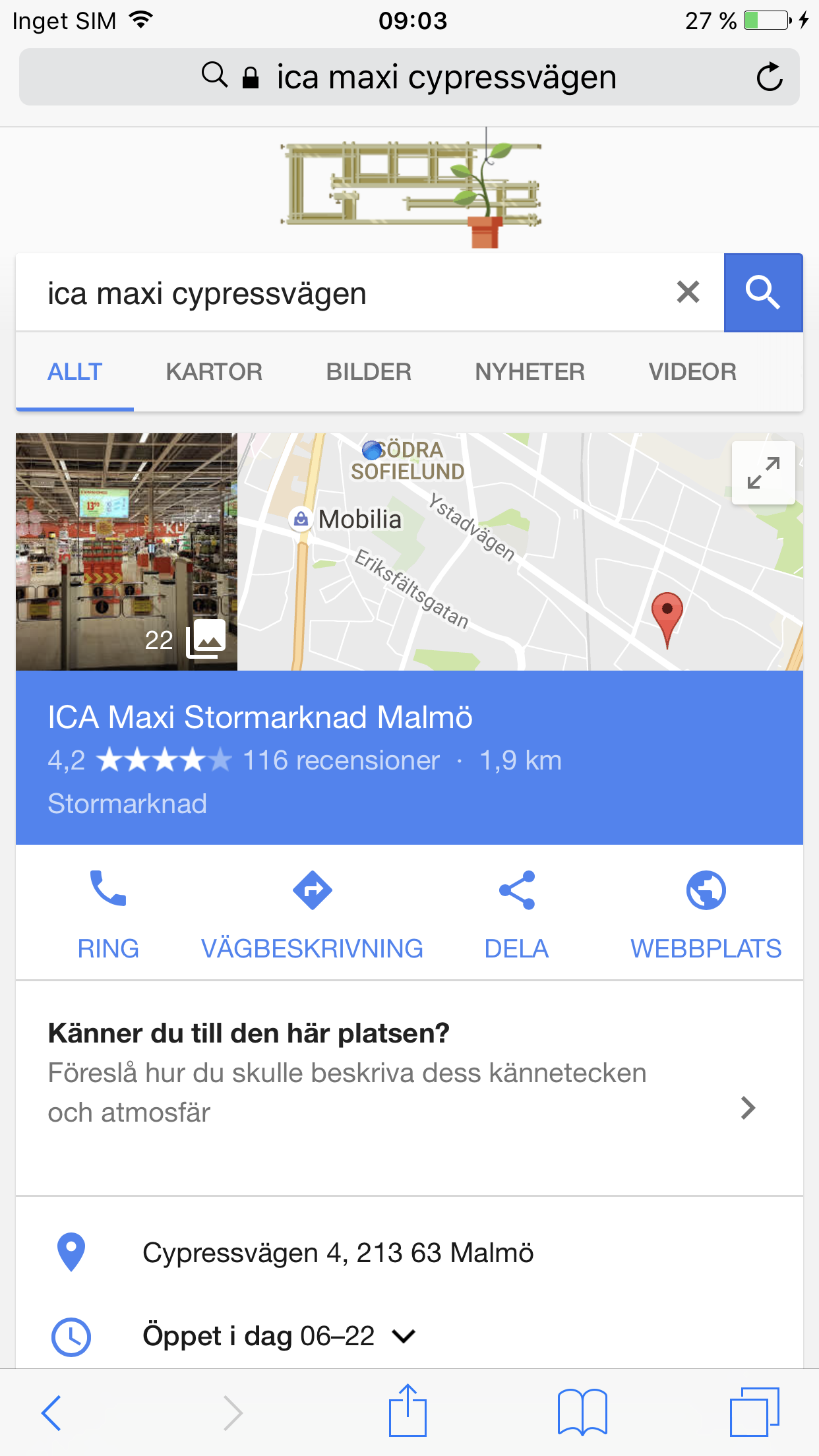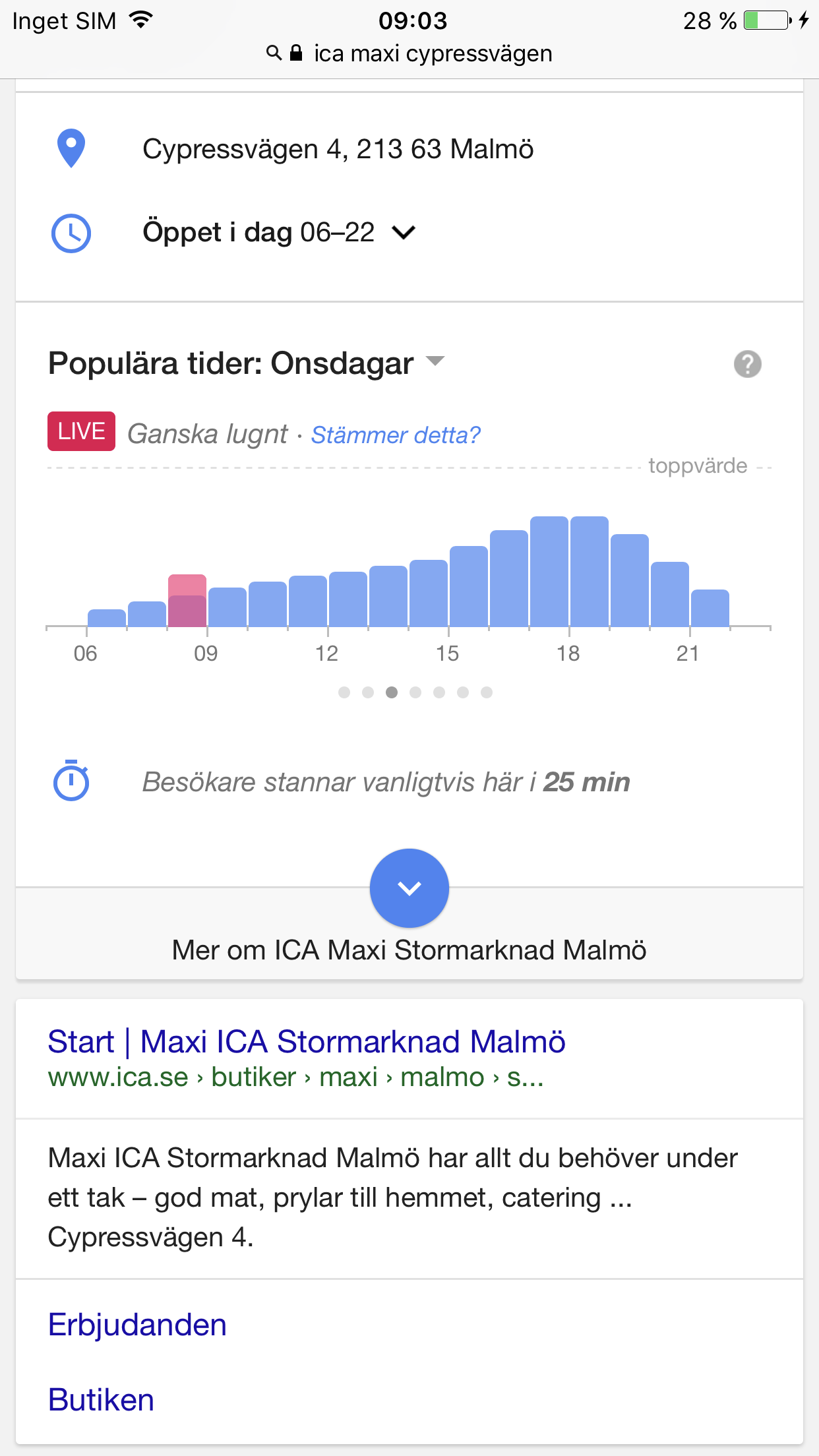 Långa köer och trånga butiker är sällan roliga att besöka. Med Google Maps kan du se hur många som är på en specifik plats just nu och hur många det troligen kommer vara där senare samma dag eller vecka. Gå till Google Maps och sök efter den plats du är intresserad av. I exemplet nedan söker vi efter en livsmedelsbutik. Vi klickar på platsen längst ner på skärmen och bläddrar sedan ner på sidan. Under informationen om platsen och dess öppettider finns en funktion kallad Populära tider. Här kan vi se en överblick över hur många som väntas besöka platsen under dagen. Vi ser att det inte är en så bra idé att gå dit mellan 17 och 19 men att det lugnar ner sig efter kl 20.