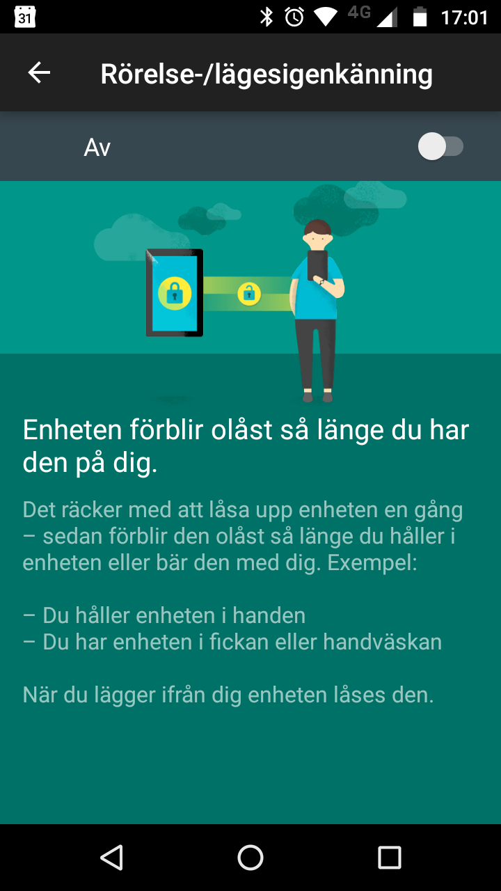 Smart Lock har också en funktion som kallas Rörelse-/lägesigenkänning. Läget gör det lättare att använda telefonen under långa perioder. Telefonen håller koll på hur du använder din telefon så det räcker att låsa upp den en gång. Sen håller den sig upplåst tills du lägger ifrån dig den.