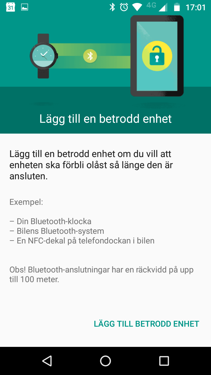När du har hittat Smart Lock och angivit din kod för att låsa upp har du ett flertal möjligheter. Du kan specificera platser, enheter eller situationer som du vill att lösenordsskyddet ska tas bort vid. Du kan till exempel säga till din telefon att lösenordsskyddet inte ska krävas när du befinner dig hemma. Du kan också säga att Smart Lock ska aktiveras när du till exempel är uppkopplad till en Bluetooth-sändare i din bil. Ett annat förslag är att koppla den till en smart klocka eller ett aktivitetsband. Så länge klockan eller bandet är i närheten kan du slippa skriva in din PIN-kod för att låsa upp mobilen.