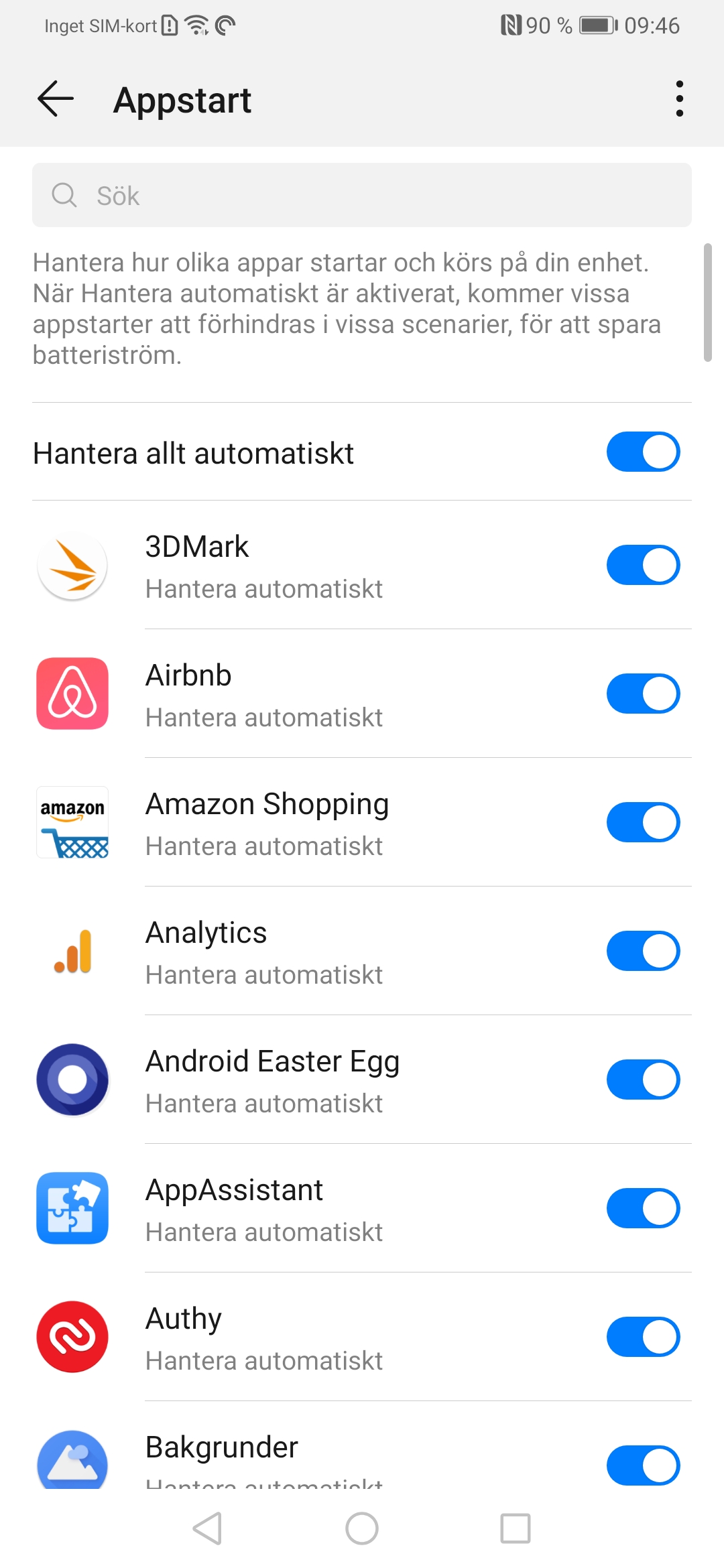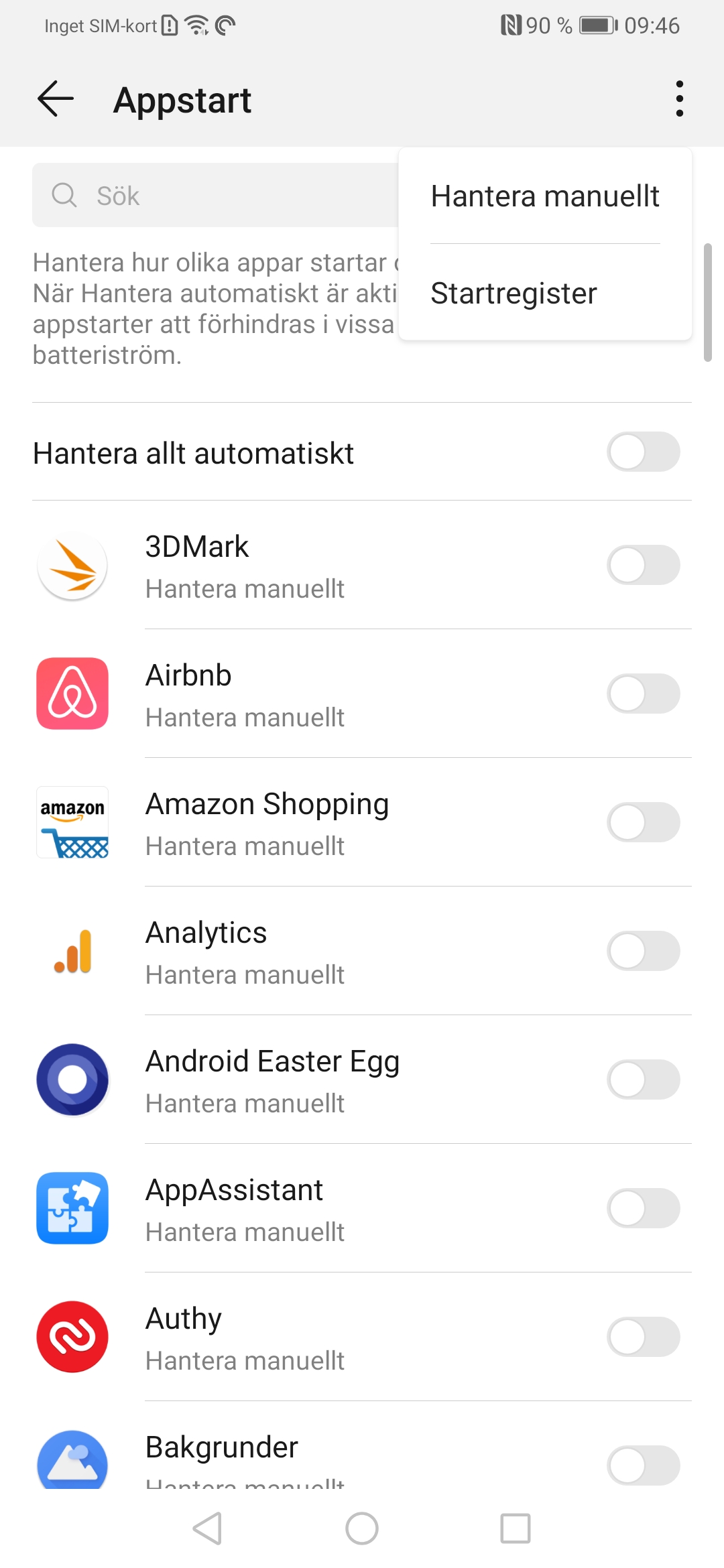 Gå till Inställningar —> Batteri —> Appstart. Klicka nu på knappen bredvid ”Hantera allt automatiskt” för att stänga av all bakgrundshantering av dina appar. Klicka sedan på de tre knapparna längst upp till höger och välj Hantera manuellt. Aktivera nu de tre inställningarna till höger om Alla och bekräfta varningarna. Du kan givetvis gå tillbaka till dessa inställningar om någon app skulle dra orimligt mycket energi.