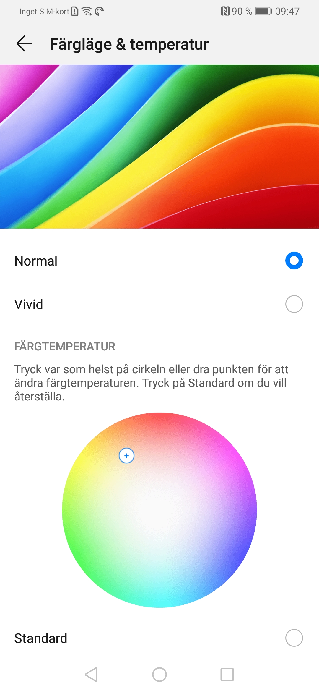 Navigera till Färgläge & temperatur. Här ska vi aktivera färgläget som heter Normal och sedan flytta markören lite uppåt, mot den orangea delen av färgcirkeln. Detta gör skärmens ton lite mer naturligt varm. Det gör främst att människors hud ser mer naturlig ut, vilket till exempel är viktigt för bra fotografering.