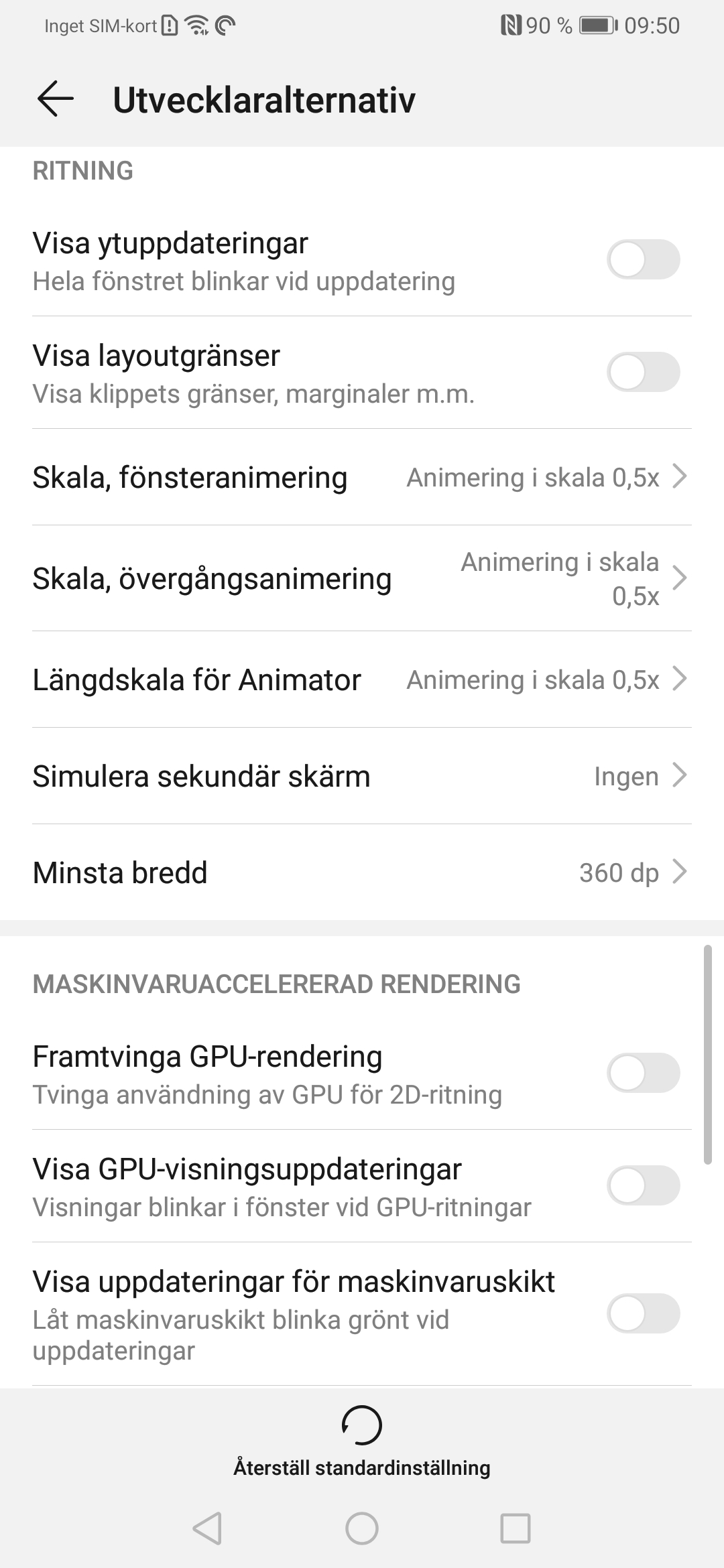 Navigerar först till Inställningar —> System —> Om telefonen. Klicka därefter på ”Version” upprepade gånger. Efter ett flertal klick kommer telefonen be dig ange ditt låsskärmslösenord. Skriv in det och du bör se ett meddelande som säger ”Nu är du en utvecklare!”. Navigera nu ett steg tillbaka och klicka på Utvecklaralternativ. Bläddra därefter ner på sidan tills du kommer till kategorin ”Ritning”. Här ska du ändra alla inställningar som har alternativen ”Animering i skala” till 0,5x.