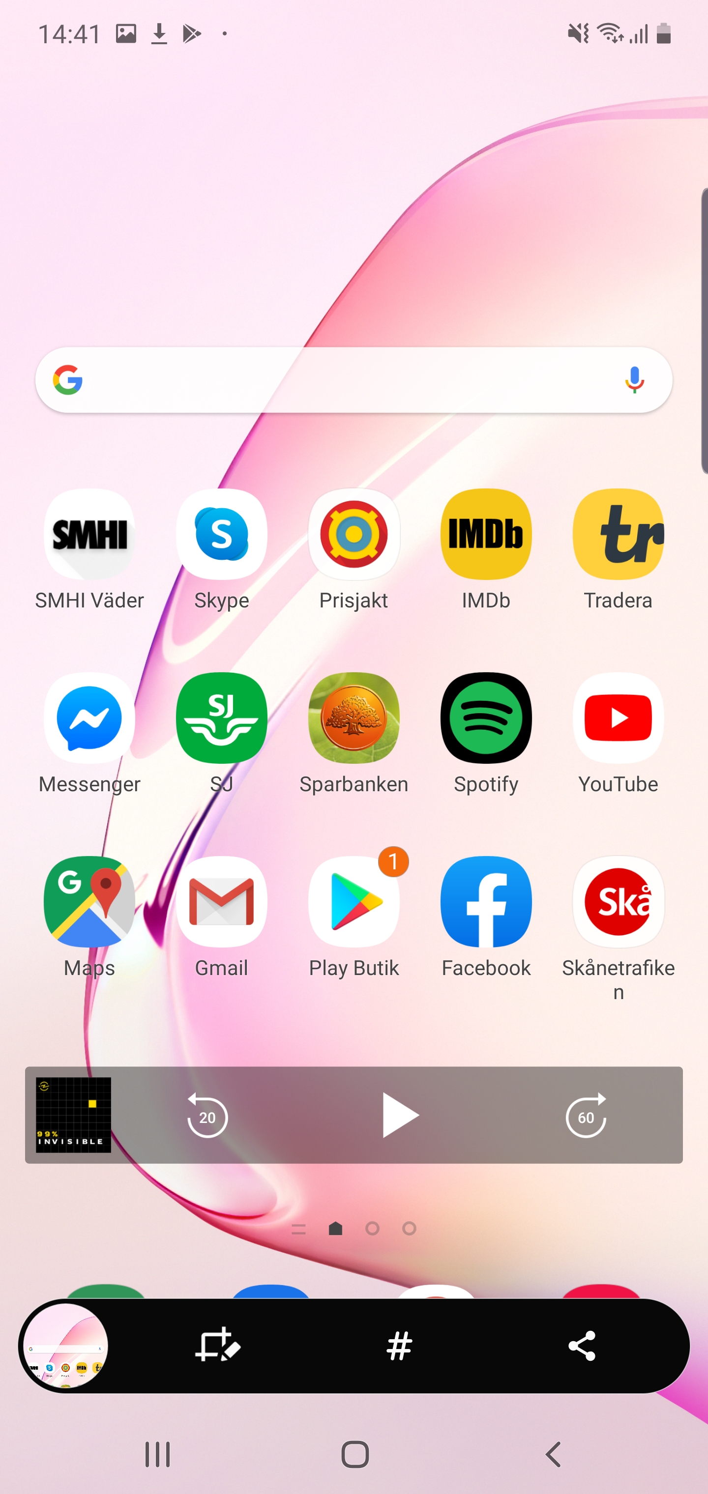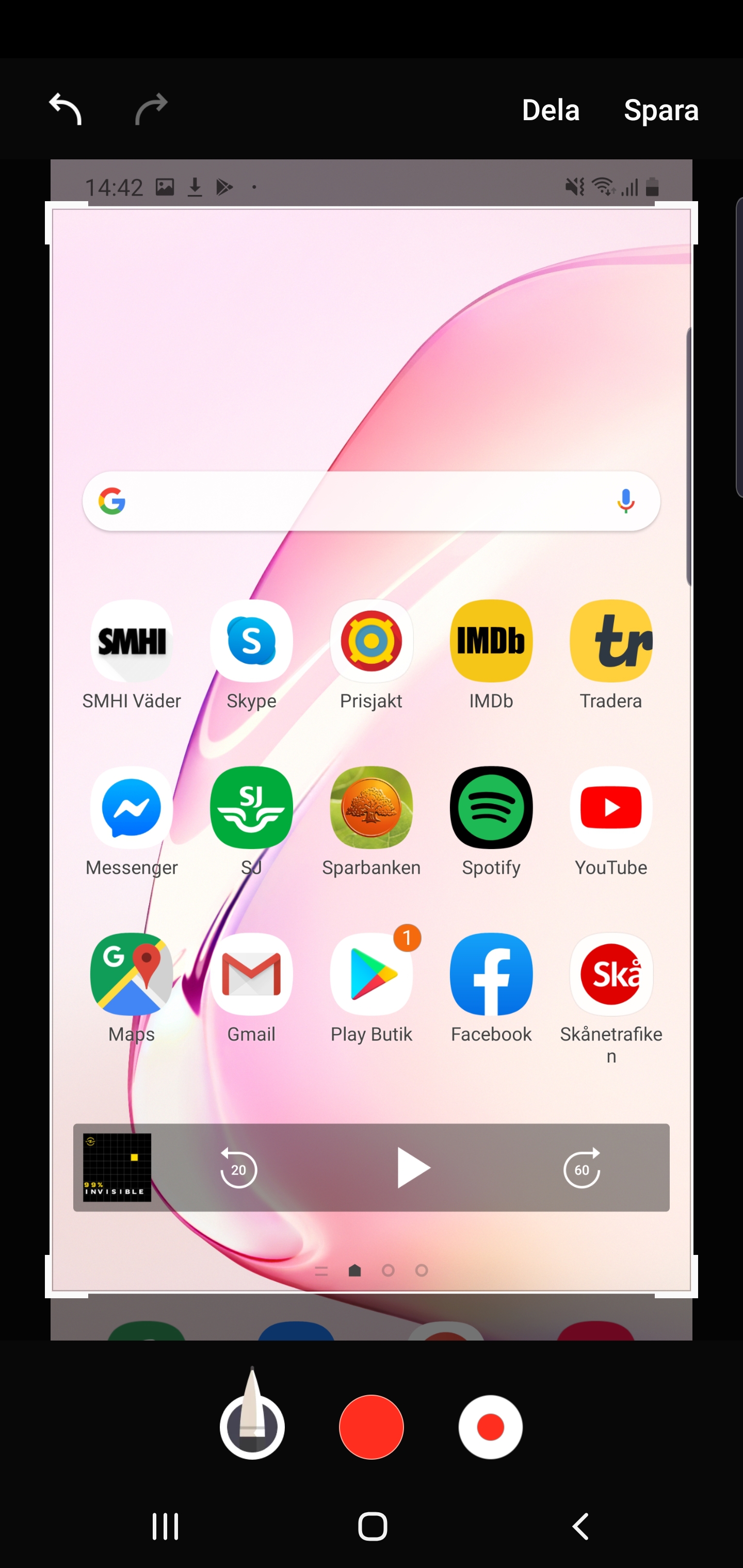 Efter att du har tagit bilden kan du redigera den eller dela den vidare. Om du först vill redigera den kan du göra det direkt, utan att behöva öppna Galleri-appen manuellt. Det dyker upp ett fält långt ner på skärmen efter att du har tagit din skärmdump. Här finns ett verktyg som visar ett skärverktyg och en penna. Klicka på den. Här kan du välja att beskära bilden eller rita på den genom att trycka på ritverktyget längst ner på skärmen. Därefter kan du trycka på Spara eller Dela.