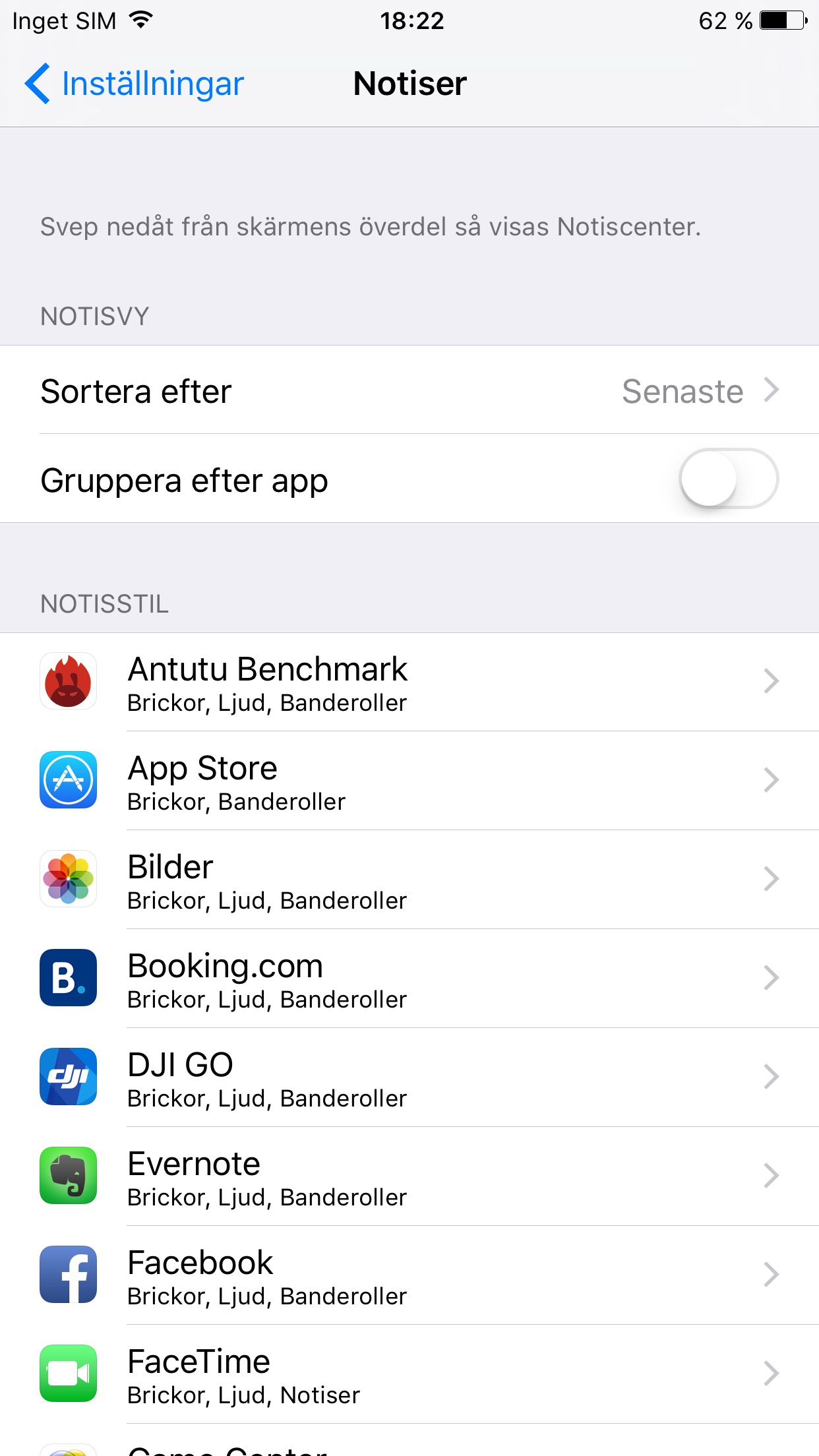 Det finns två sätt att visa notiser i iOS. Det ena är Apples gamla sätt att visa notiser och kallas just ”Notiser”. När en notis kommer in till din telefon dyker ett fönster upp på skärmen. Fönstret garanterar att du ser notisen eftersom du måste trycka på en knapp för att det ska försvinna men det kan också störa. ”Notiser” kan vara särskilt irriterande när du spelar spel i mobilen eftersom de avbryter den app som är öppen och lägger sig ovanpå.