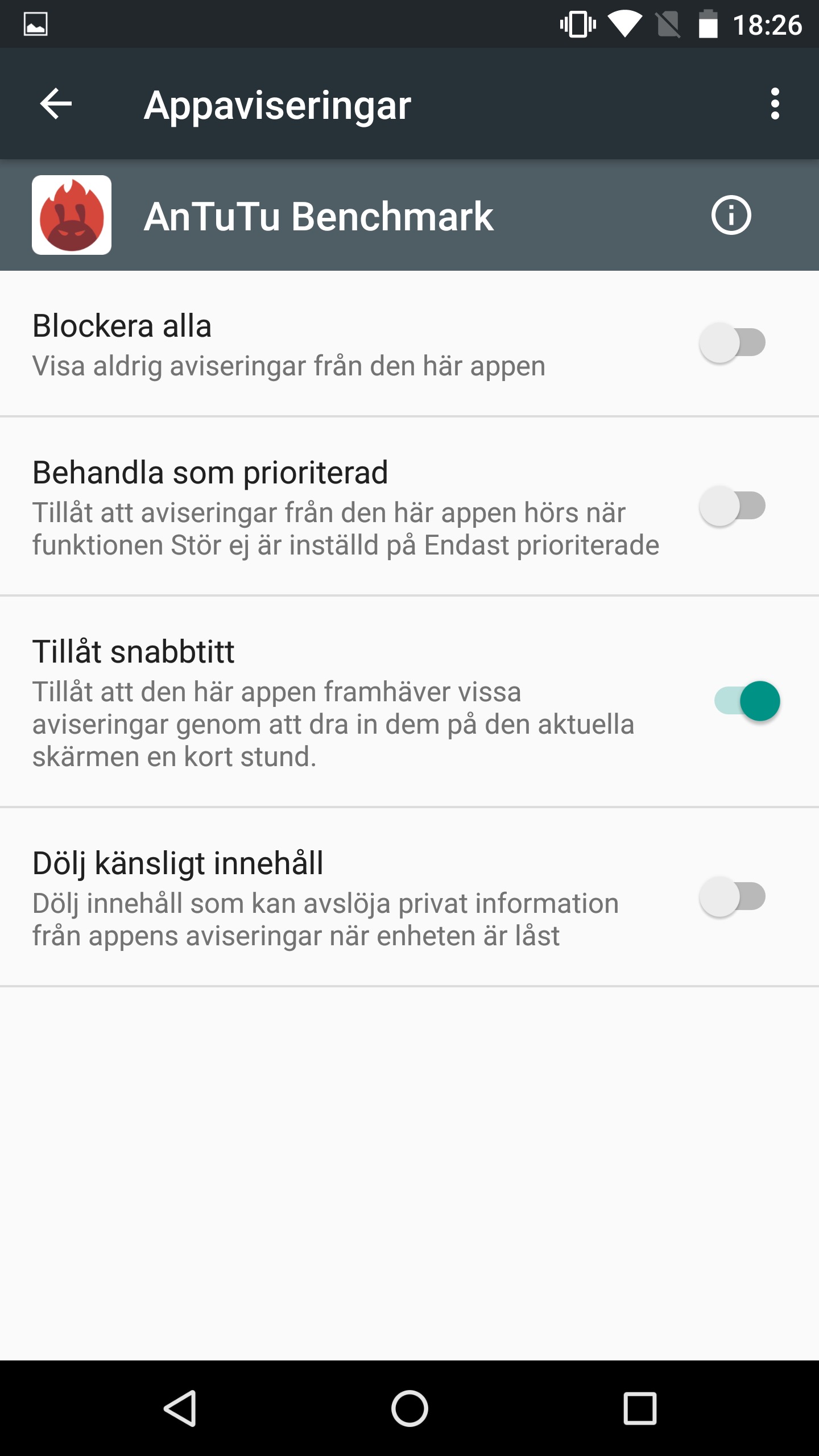 ”Tillåt snabbtitt” låter dig bestämma om appars notiser får dyka upp på den övre delen av skärmen under en kort tid innan den lägger sig bland alla andra notiser. Snabbtitt låter dig exempelvis se de första orden i ett SMS som du just fått. Slutligen kan du också dölja känsligt innehåll från låsskärmen för specifika appar med knappen ”Dölj känsligt innehåll”.