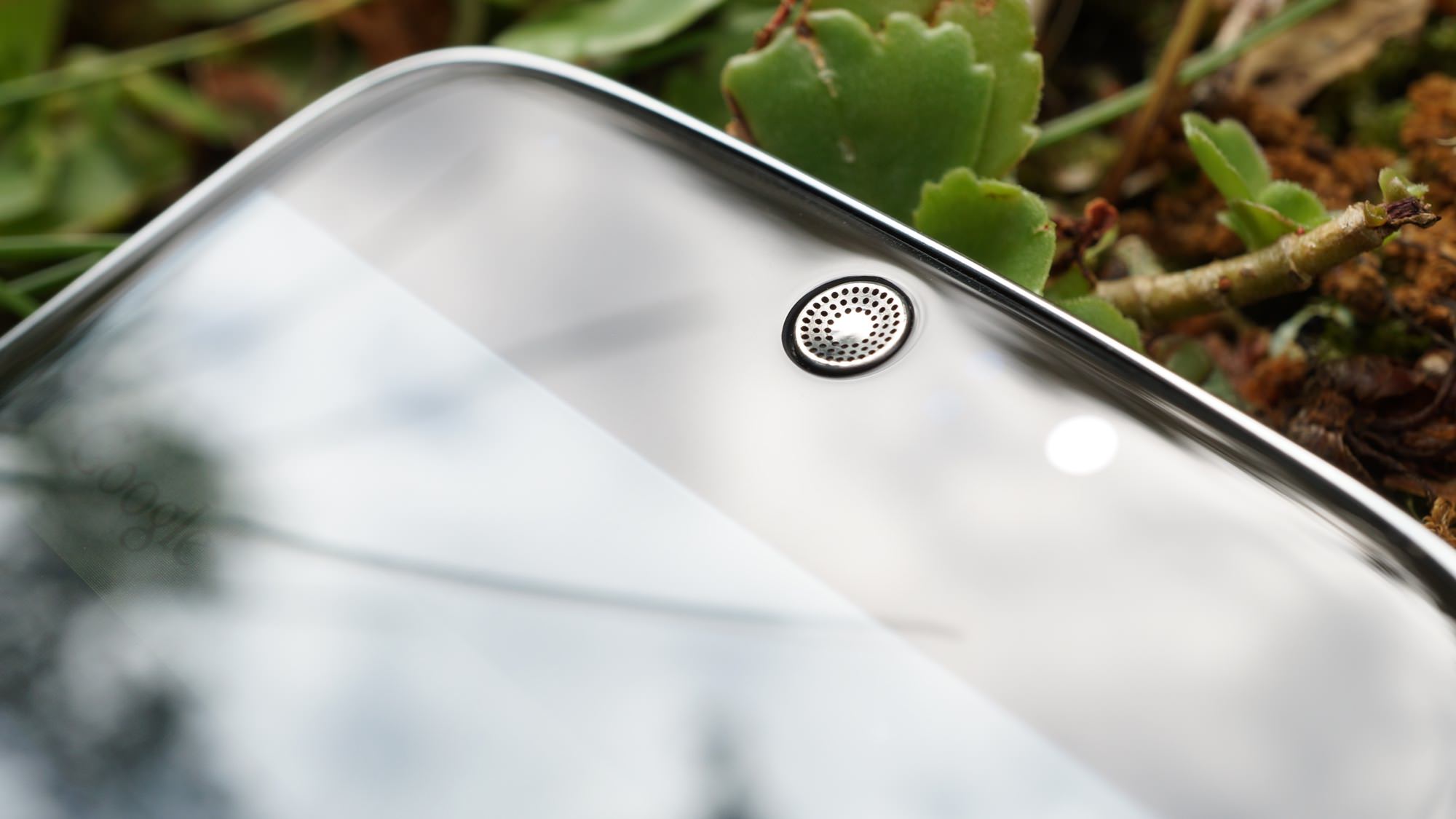 Telefonens framsida är helt täkt av glas. Glaset sträcker sig ända ut till dess kanter och har en lätt rundning längst ut. Runt glaset finns en tunn blank silverfärgad ram som troligen är tänkt att tolkas som metall. Håller man i telefonen är det dock uppenbart att ramen är tillverkad av plast och att egentligen inga yttre delar av telefonen är gjorda av något annat än glas och plast.