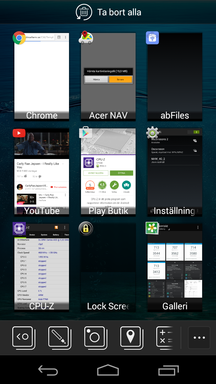 Vi hade kanske kunnat acceptera Android 4.4.4 som operativsystem om en uppdatering till Android 5.0 varit på ingång inom en mycket snar framtid och om Acer valt att göra sig av med sitt överliggande användargränssnitt. Så är dock inte fallet. Ovanpå Android har Acer nämligen lagt ett gränssnitt som känns som är opraktiskt och inte särskilt estetiskt tilltalande. Det enda värdefulla i Acers anpassning av operativsystemet är dess flytande applikationer som kan startas från applikationsbytaren. Dessa flytande appar ger användare möjlighet att exempelvis ta bilder samtidigt som en Youtube-video spelas i bakgrunden eller ta anteckningar samtidigt som Facebook visas i bakgrunden. Utöver det tycker vi att Acers anpassningar av Android bara gör operativsystemet fulare.