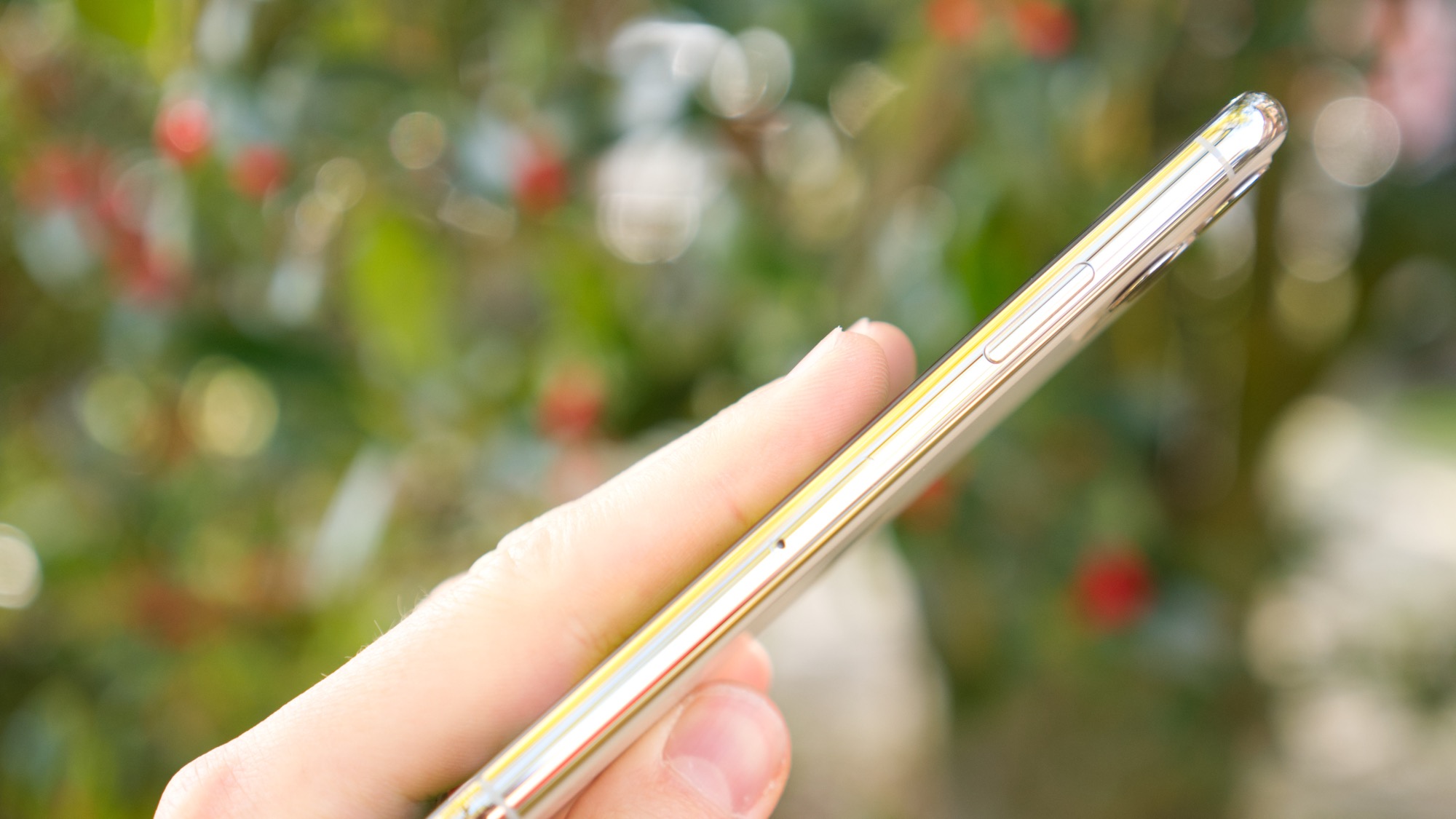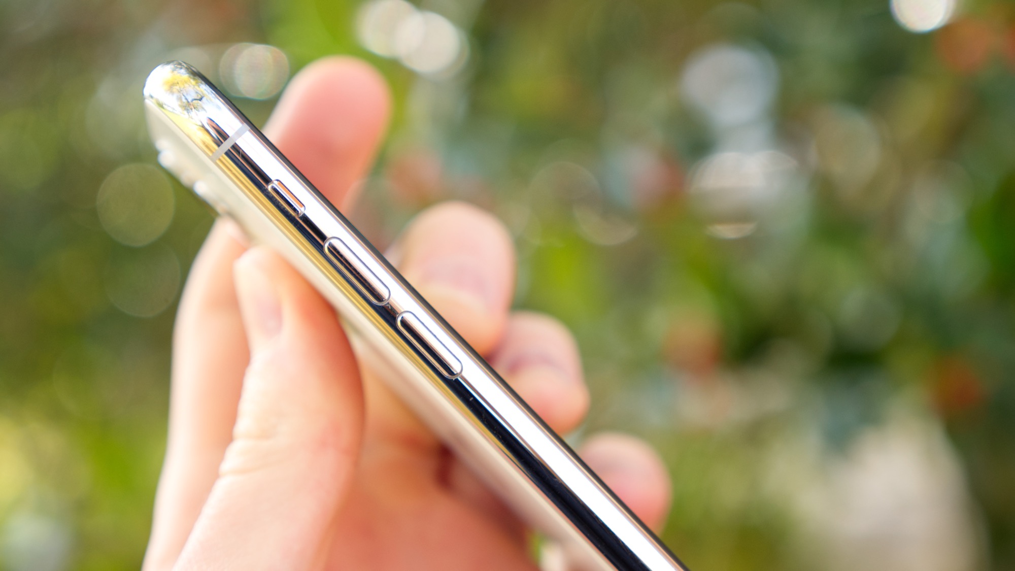 På de rundade stålsidorna finns en oförändrad uppsättning knappar och portar. På höger sida finns en på/av-knapp som är stor och enkel att använda med ett tydligt klick. Här finns också en SIM-kortsläsare som fortfarande bara har plats för ett kort och inget stöd för microSD-kort. På vänster sida finns en fysisk brytare för att sätta telefonen i tyst ljudläge. Det är en funktion som Apple länge varit nästan ensamma om och som fortsätter vara en praktisk funktion. Under den finns två volymknappar som fungerar bra. Vi önskar dock att Apple kunde göra något åt faktumet att det är lätt att råka trycka in både på/av-knappen och knappen för volym upp samtidigt när de sitter på var sin sida. Det gör nämligen att vi har en mapp med ofrivilliga skärmdumpar i mobilen efter nån vecka.