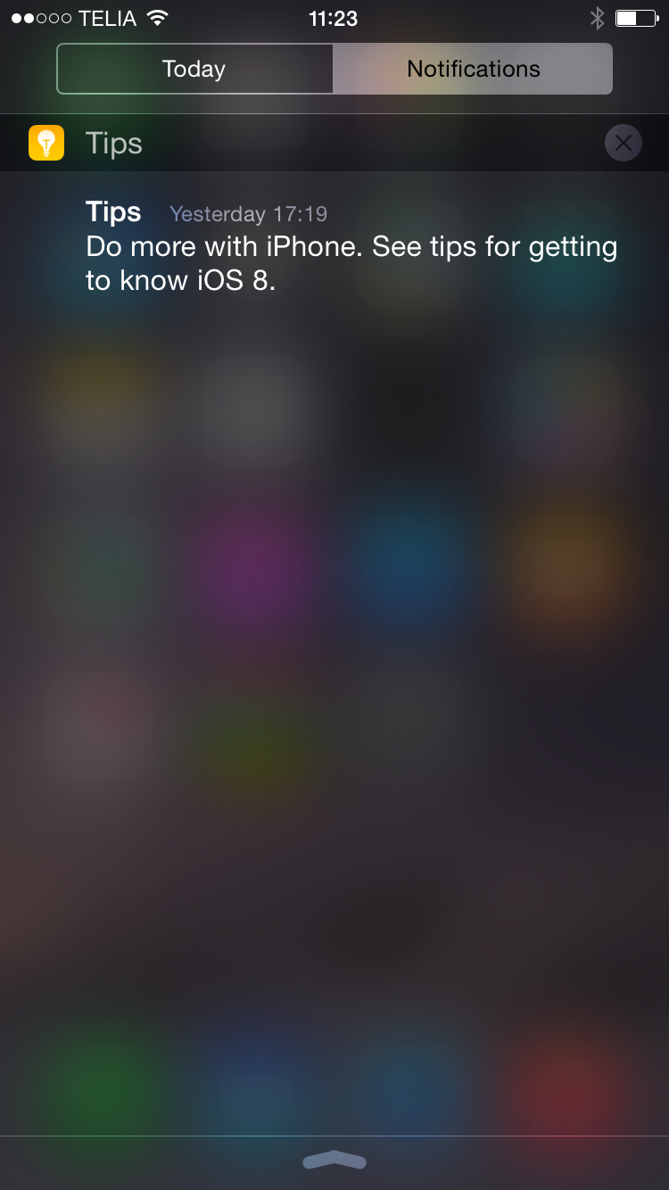 I själva notifikationslisten, som istället nås genom en svepning ovanifrån, finns det två olika flikar. ”Today”-fliken ger tillgång till kalenderhändelser och widgets, exempelvis för att-göra-listor, väder, börsnotiser eller andra tredjepartsfunktioner. Den andra fliken ger sedan tillgång till traditionella notiser, som samtal, SMS och epost.