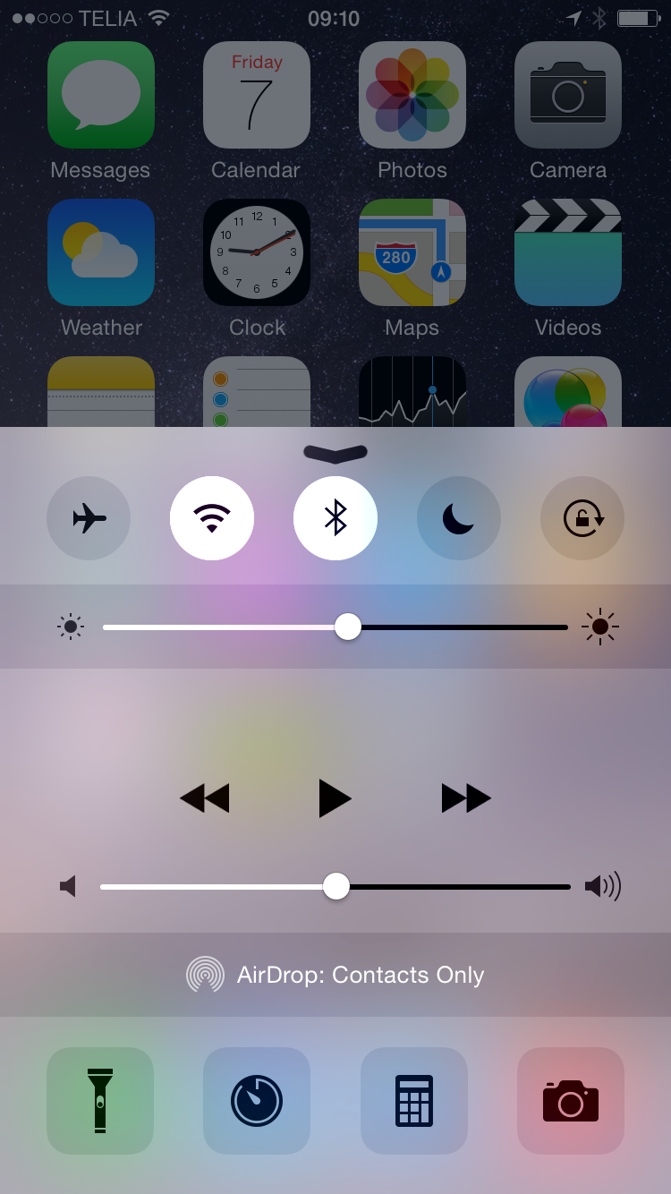 Till skillnad från Android som har snabb-toggles och notiser i samma list har Apple delat upp dessa i olika i två verktyg. En svepning nedifrån ger tillgång till regelring av ljusstyrkan, musikkontroller (universell för alla musikspelare), volymreglage, snabbknappar för flygplansläge, wifi, bluetooth, ”do not disturb” (som stänger av notifikationer för alla eller specifika händelser), samt rotationslås. Längre ner finns även genvägar till timer, miniräknare, kamera samt en toggle för ficklampa. Den här listen är åtkomlig även från låsskärmen och är riktigt smidig, men här hade vi gärna också sett en genväg till telefonens inställningar, som fortfarande måste bläddras fram bland apparna för att exempelvis välja trådlöst nätverk.