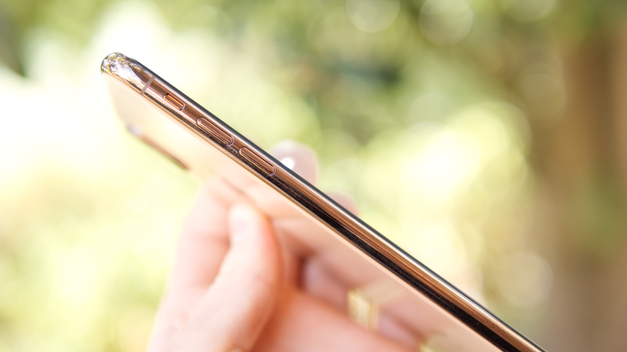 Glaset på baksidan möts alltså av rostfritt stål längs sidorna. Metallen är polerad och på den guldfärgade och svarta versionen är den dessutom färgad. I likhet med iPhone X är metallens färg bara ytlig. Så fort den repas skiner den silver-gråa färgen från metallen igenom och det går inte att polera tillbaka originalfärgen. Det skiljer alltså de färgade versionerna från den vit/gråa versionen av iPhone XS Max som kan poleras tillbaka till sin originalfärg.