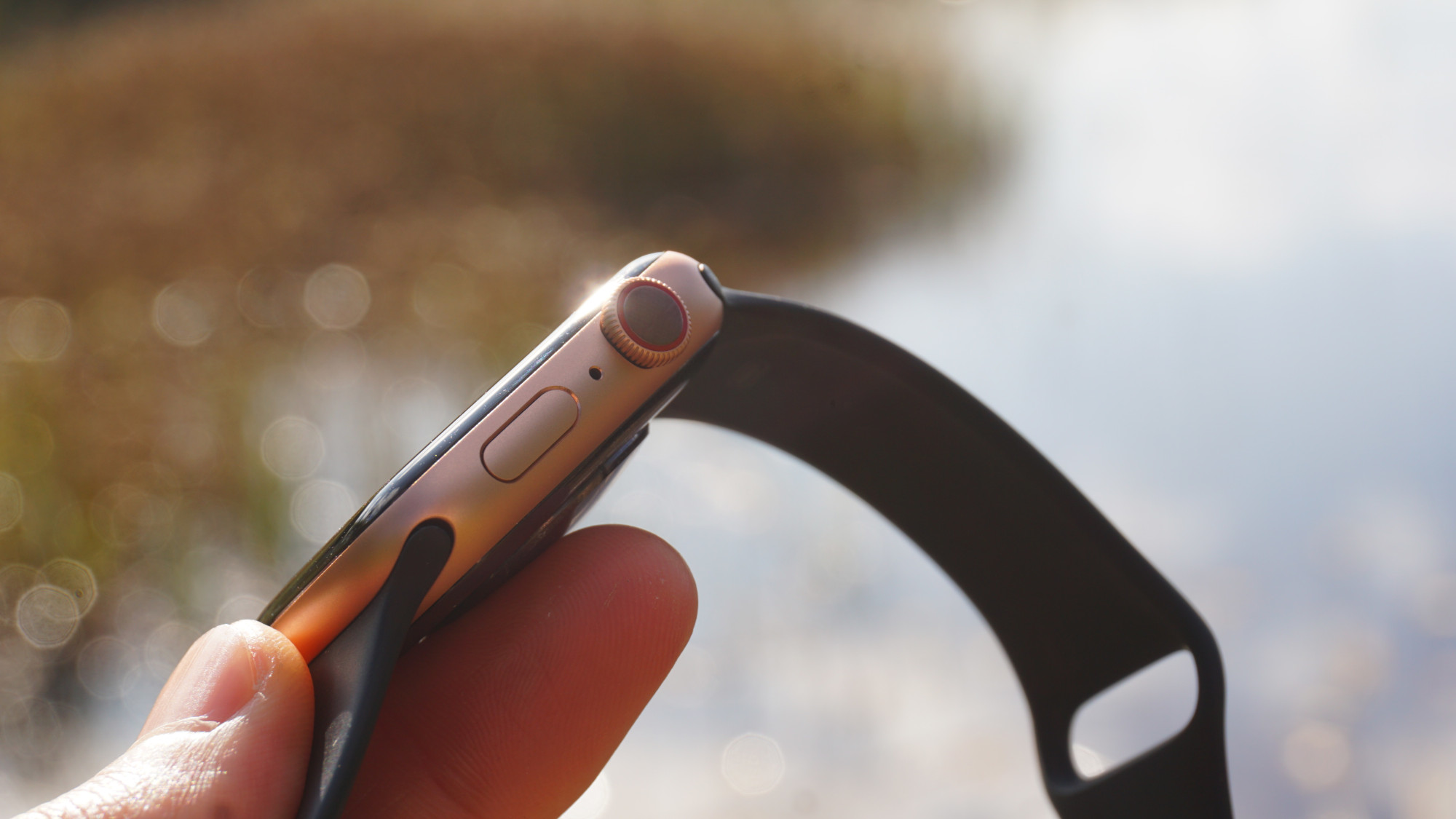 Även knapparna är sig lika sedan den första Apple Watch-modellen. En roterande krona kan användas för att navigera i mjukvaran och en nedre knapp smälter in med kroppen. Båda knapparna är lätta att hitta och ger ifrån sig ett enkelt men tydligt klick när vi trycker på dem. I den roterande kronan finns även Apples EKG-mätare. Mellan knapparna sitter mikrofonen och på motsatt sida sitter klockans högtalare. På undersidan ser vi en yta av keramik och safirkristaller som huserar pulsmätaren, omringad av elektroner för EKG-mätaren. Undersidan är lätt upphöjd från resten av kroppen men skapar inget obehag på armen. Här hittar vi inga synliga laddkontakter då Apple Watch 5 laddar trådlöst. Klockan har dock inte stöd för den trådlösa standarden Qi.