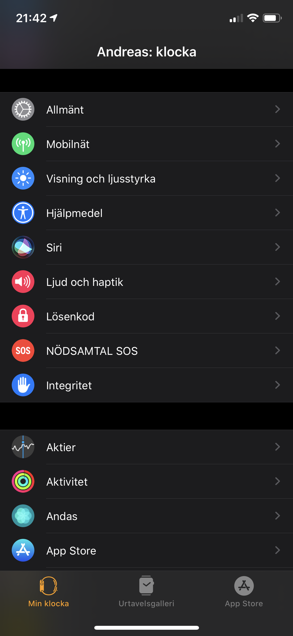 För att synkronisera hälsa och data direkt från klockan används appen Aktivitet, som i stora drag visar samma information som klockan visar men med möjligheten att titta på flera dagar, veckor eller månader tillbaka. Aktivitet samlar och visar de tre aktivitetsringarna för en överskådlig blick samt mer ingående data för steg och trappor. Här ser vi också Trender som visar om klockan identifierar mer eller mindre rörelse och aktivitet jämfört med tidigare perioder. I Aktivitet finns också funktioner för att dela framsteg med och utmana vänner. För den som gillar framsteg, eller så kallade ”achievements”, har Apple också bakat in diverse medaljer som användare kan låsa upp.