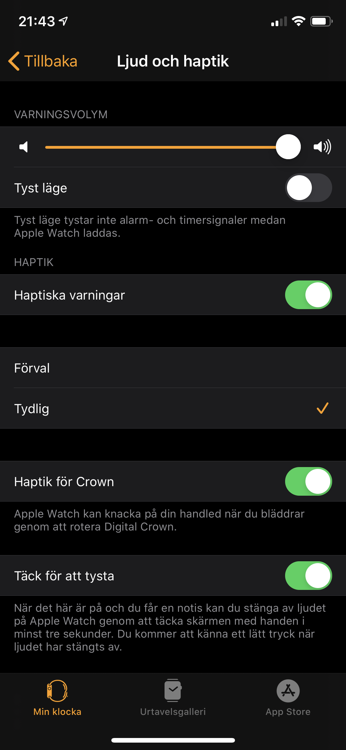 Att ha skärmen ”Alltid på” fungerar precis som det låter. När vi aktiverar skärmen tänds den till sitt högpresterande läge, precis som om när den tidigare vore släckt. När klockan inte används dimmas skärmen ner men förblir läsbar. Detta fungerar med samtliga klockansikten och det går att välja om ”känslig data” ska visas i viloläget. För att bevara ett bra flyt i gränssnittet visas inte klockansiktet om vi till exempel har musikappen öppen. När skärmen dimmas syns istället klockan på skärmens högra sida. Att ha skärmen ”Alltid på” fungerar alltså precis som det låter och i sann Apple Watch-anda ser vi inga avbrott i hur skärmen tänds eller släcks. Vi saknar dock möjlighet att enkelt släcka skärmen på natten, både för att ljuset inte ska störa och för en liten batteribesparing. Det närmsta vi hittar är biografläget, som släcker skärmen och dämpar notiser. Vi saknar ett tydligare val.