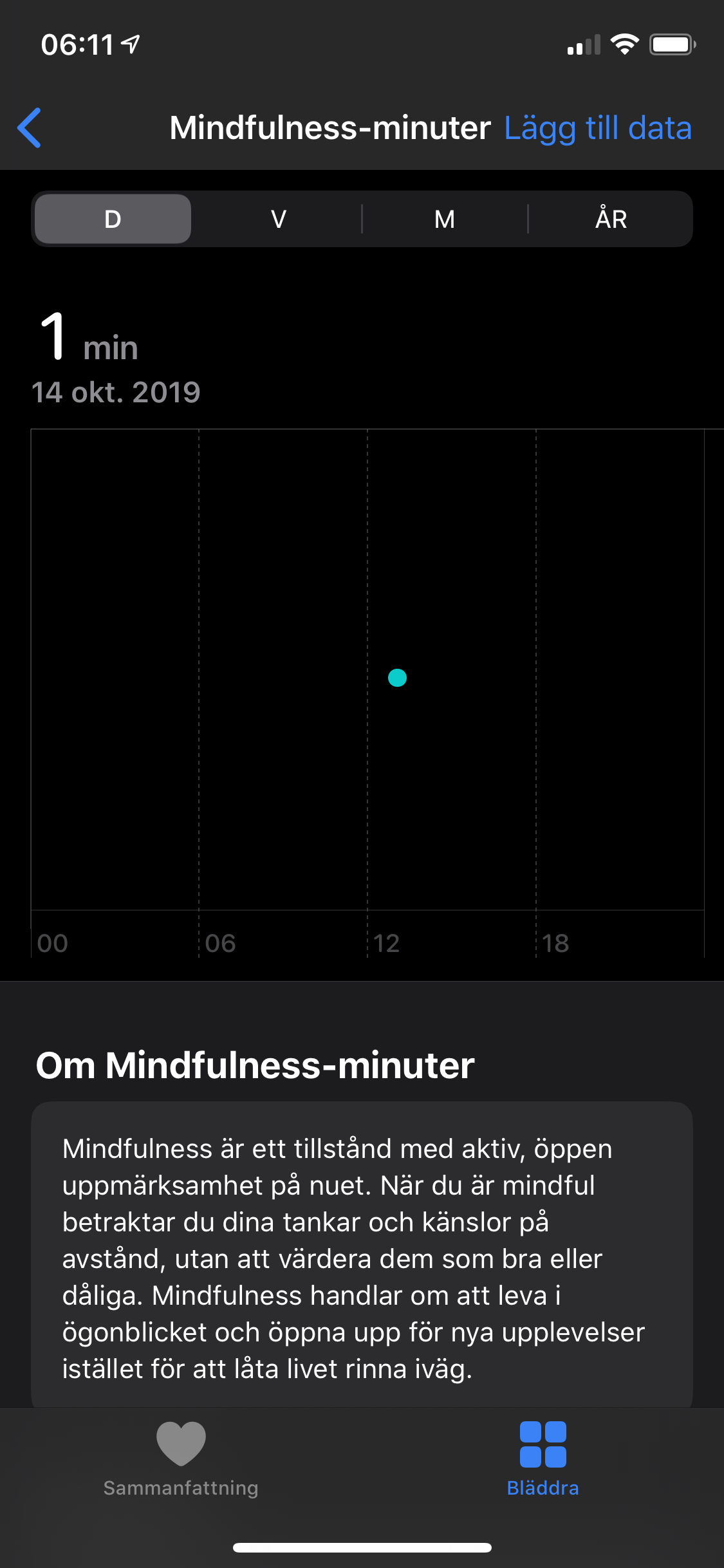 En populär mätning som saknas på Watch 4 är sömnmätning, något som Apple än så länge inte utför. Det finns tredjepartsappar för det men inget inbyggt. Klockan påminner oss däremot gärna om att ta en paus och andas två gånger om dagen. Den inbyggda funktionen kallas Mindfulness-minuter och indikerar visuellt och genom vibrationer när vi ska andas in och ut. Någon intressant data sparas dock inte av detta, då klockan saknar sensorer för att exempelvis mäta syret i blodet. Istället lagras andningstillfällen med prickar på ett diagram, som ett plus i kanten för att vi tog oss tid att sitta stilla.