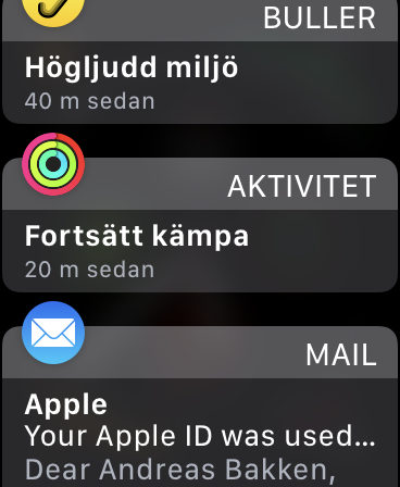 För inkomna notiser erbjuder Watch OS stora möjligheter att anpassa vad och hur information visas för förinstallerade appar. Majoriteten av de förinstallerade apparna erbjuder inställningar för att antingen spegla telefonnotiser eller anpassa hur de tas emot på klockan med ljud och haptik. För tredjepartsappar går det enbart att välja om notiser ska skickas till klockan eller inte. Mottagna notiser har förmågan att ge mycket information på ett smidigt sätt, tack vare skärmens storlek och formfaktor. Dessa går att interagera med, beroende på vilken app det är, genom att exempelvis svara på meddelanden. Svarsmöjligheter inkluderar röstdiktering, emojis eller förinställda snabbsvar. Att diktera meddelanden fungerar mycket bra och Siri tar emot specialtecken som ”punkt” och ”utropstecken” smidigt. Vi saknar dock möjligheten att skriva på ett tangentbord för stunder när det inte passar att prata in ett meddelande.