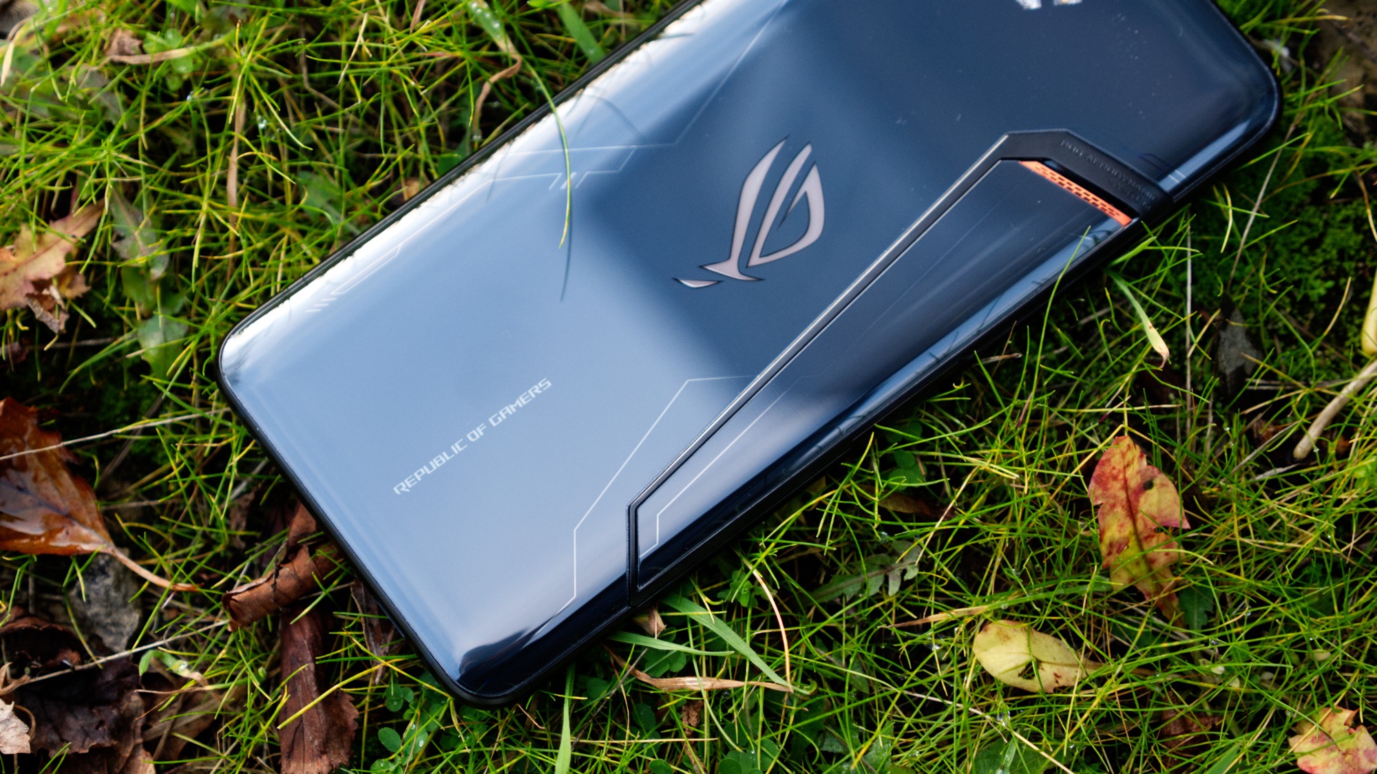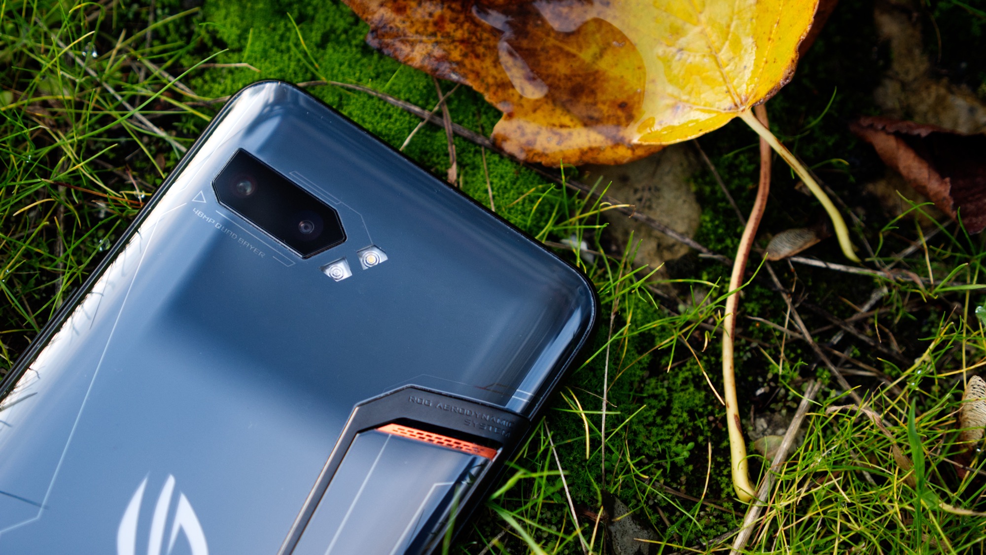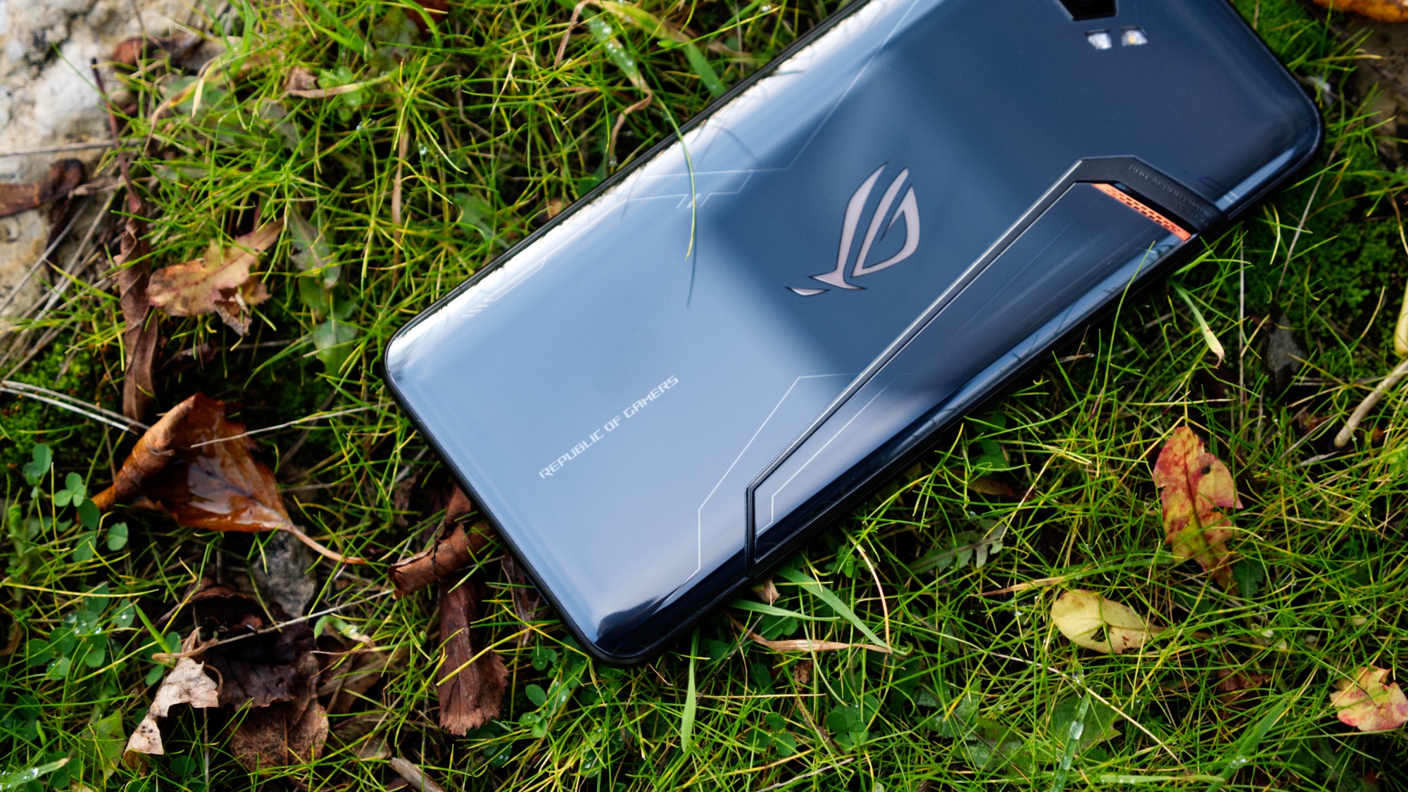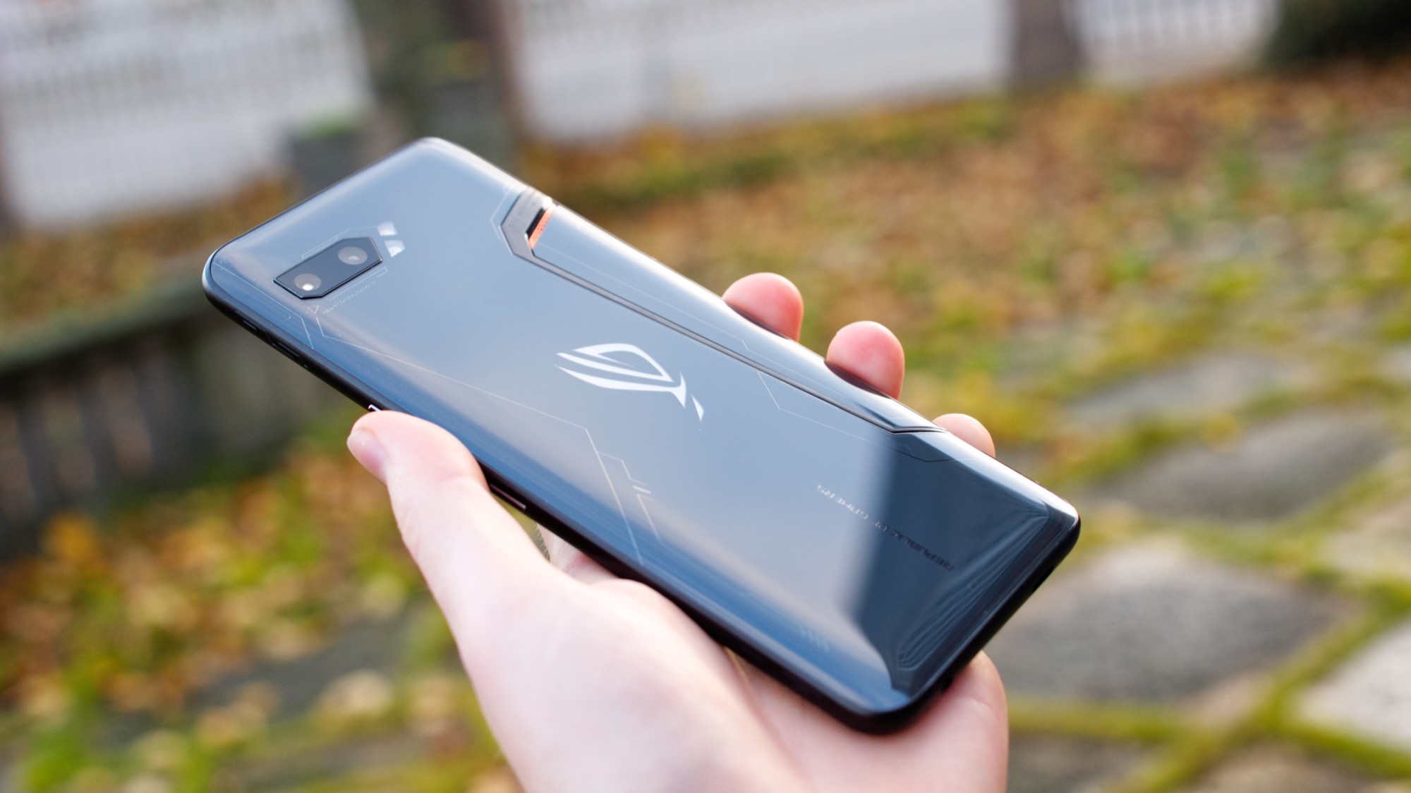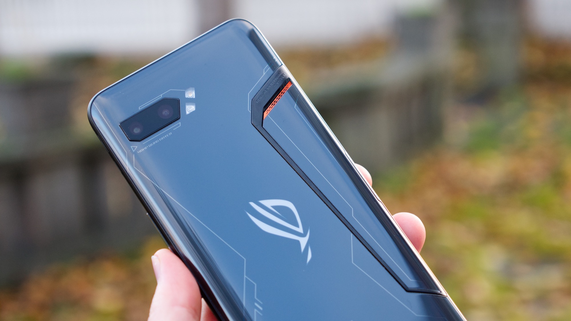 På mitten av den mörka baksidan sitter Asus ROG-loggan. Den har en ljusgrå ton som sticker ut från den mörkare baksidan. Loggan har dock en hemlighet. Bakom den finns en uppsättning LED-lampor som sprider ett jämnt ljus från ikonen. Ljuset kan till exempel vara aktivt när telefonen används för spel, när notiser har kommit in eller när den laddar. Med full RGB-färg kan användaren själv bestämma om den till exempel ska skifta i färg eller ha en fast färg. Det ger en intressant anpassningsbarhet som få konkurrenter kan skryta med. Den passar även in i en gamingkultur som är fylld av färgglada LED-lampor.