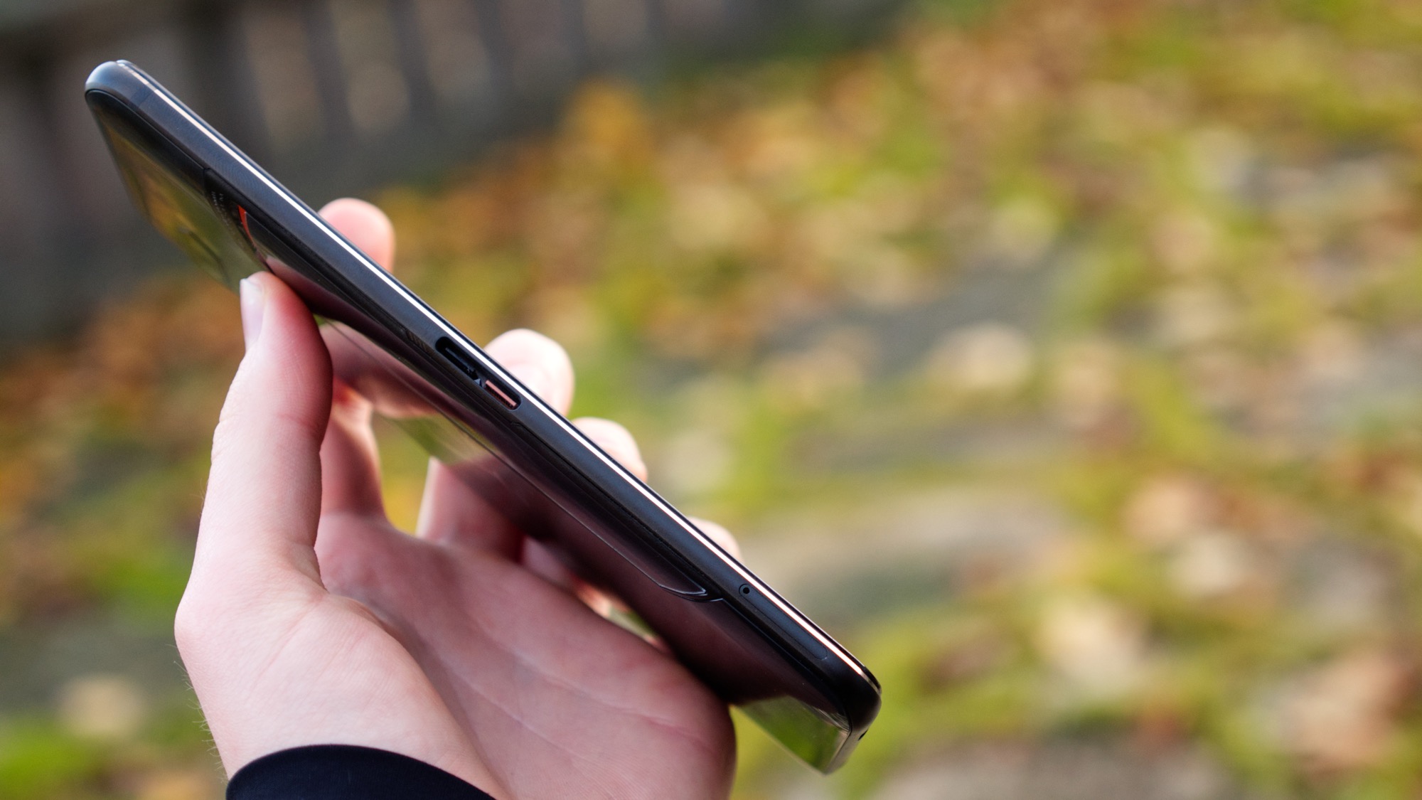 Längs sidorna av ROG Phone II finns en stadig metallram. Längs höger sida finns en på/av-knapp och två volymkanppar som ger riktigt bra fysisk återkoppling. På den motsatta sidan finns en kortläsare med plats för dubbla nanoSIM-kort. Här finns alltså ingen microSD-kortläsare. Det är sannolikt inget problem för de allra flesta konsumenter, med tanke på att 512 GB lagring gömmer sig på insidan. I en så stor telefon med så många funktioner hade nog ändå en microSD-kortläsare passat bra. Särskilt till den billigare 128 GB-modellen.