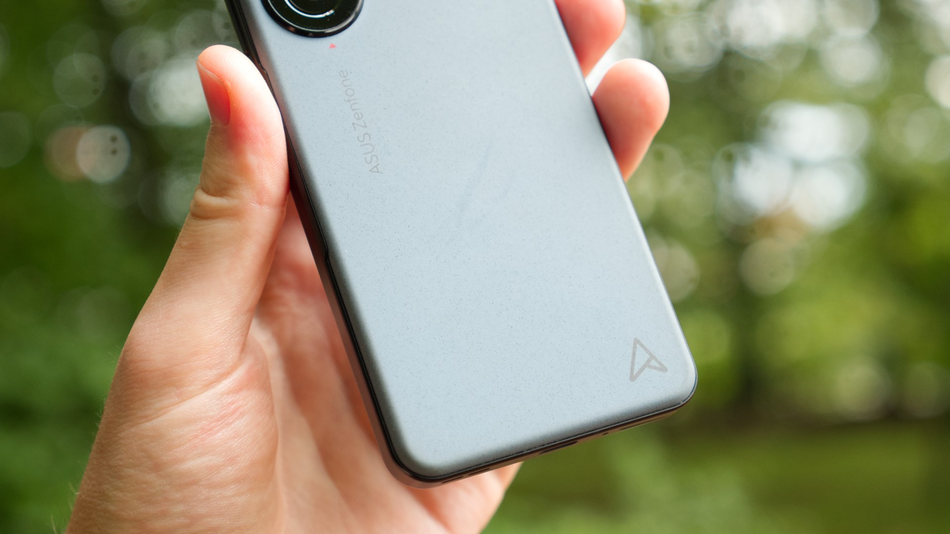 Det finns fortfarande gott om detaljer som gör Zenfone 10 unik, bortom telefonens kompakta format. För det första har den ett ovanligt bakstycke med en sandpapper-liknande yta. Det ger oss ett ovanligt bra grepp om telefonen. Bakstycket är gjort av plast men tack vare sin ytbehandling är inte repor särskilt lätta att se. Det kan dock bli lite smutsigt men kan enkelt tvättas. Bakstycket känns inte billigt i handen. Ändå har det fördelen av att vara gjort av plast, som inte spricker som glas. Med det sagt kan kunder ändå skydda telefonen mot repor och fallskador med ett bra inkluderat hårdplast-skal. Det gillar vi verkligen! Särskilt eftersom små tillverkare såsom Asus ofta har mycket begränsad tillgång till tredjepartstillverkares skal.