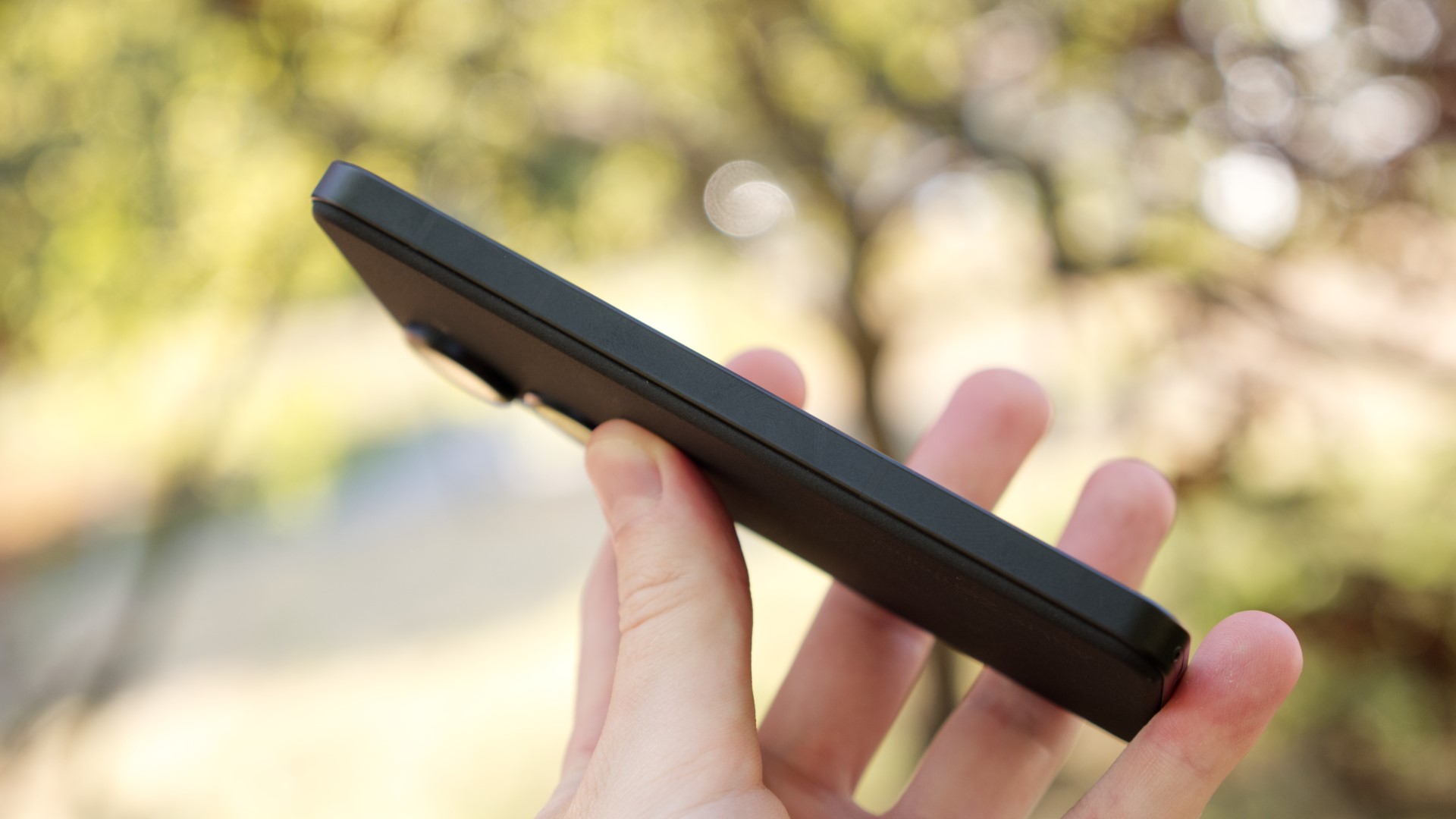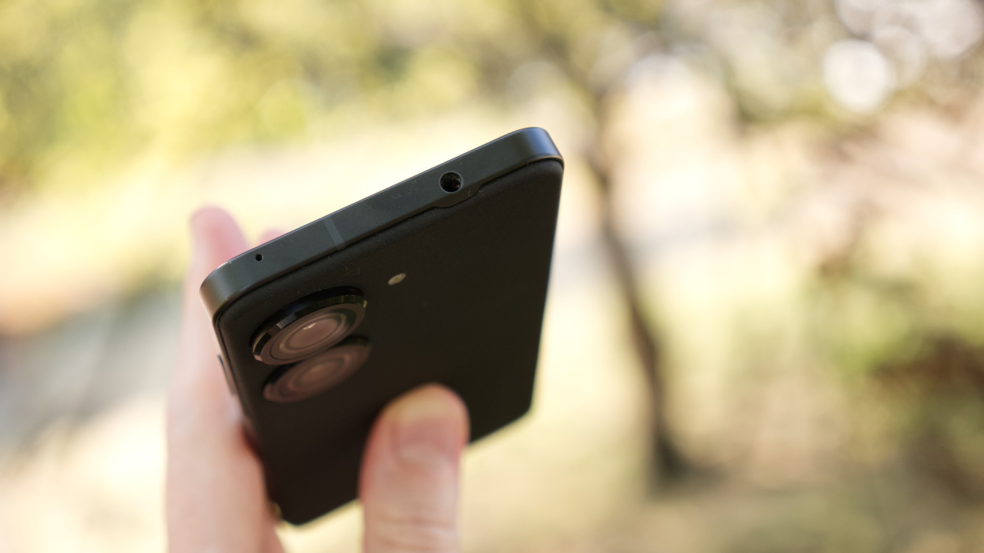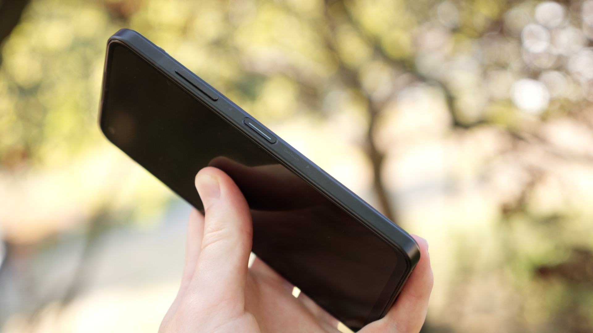 Trots att Zenfone 9 är liten, har Asus lyckats klämma in en hörlursport i ovankanten. Runt telefonen finns också en kortläsare med plats för dubbla nanoSIM-kort men inget stöd för eSIM. Längs höger sida finns en fingeravtrycksläsare som är snabb och pålitlig och som kan användas med gester för att till exempel dra ner notisfältet. Det är en smart idé som gör telefonen ännu enklare att använda med en hand. Läsaren är dock så känslig att det är lätt att dra ner notisfältet av misstag. Efter några dagars användning stängde vi därför av den funktionen.