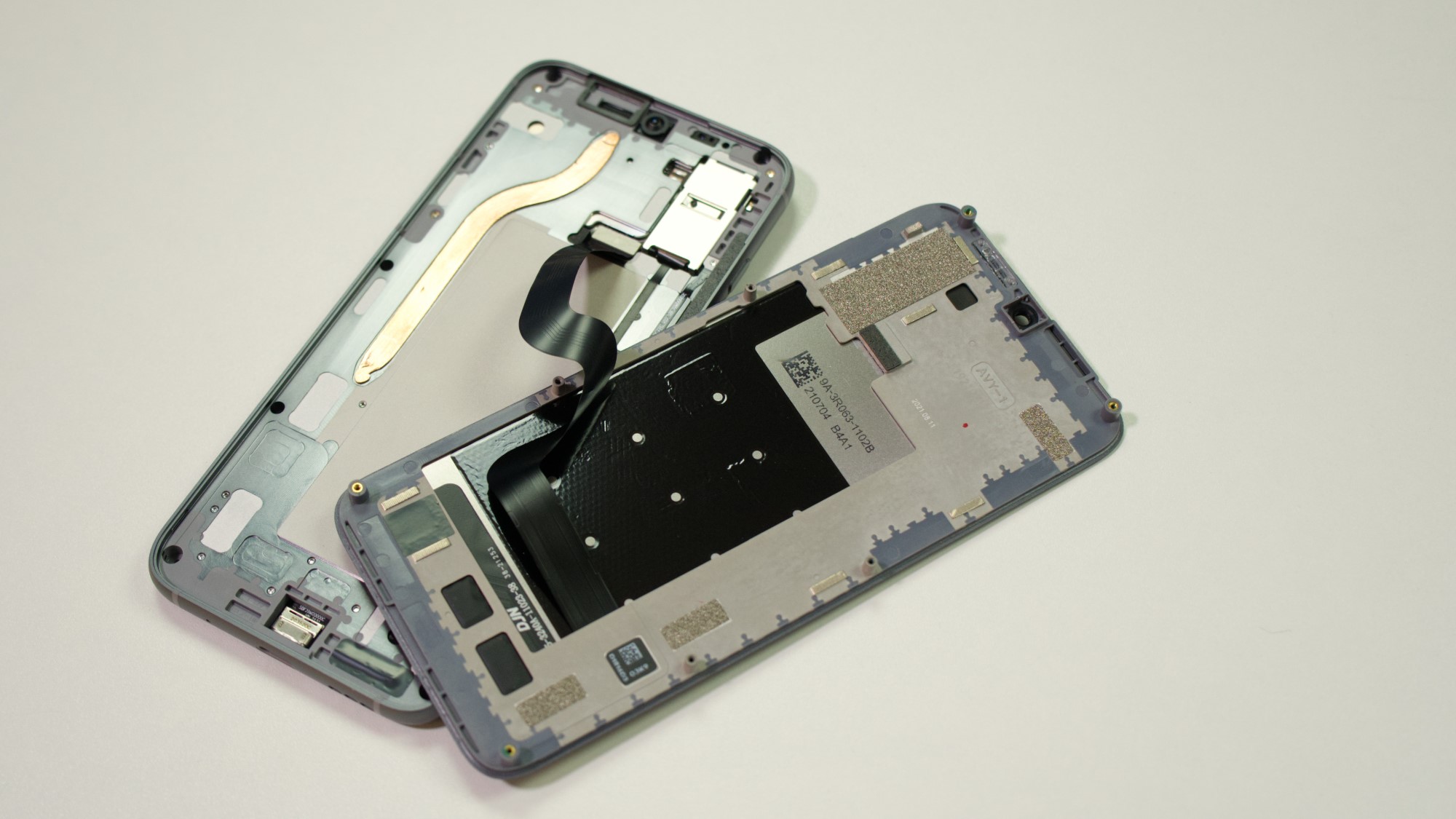 Under bakstycket finns något som vi inte sett på mycket länge: ett utbytbart batteri. Batteriet kan lyftas ut med en nagel för att bytas ut när det slitits ut eller för att fördubbla telefonens batteritid med ett extrabatteri. Batteriet måste lyftas ut för att ge tillgång till nanoSIM- och microSD-kort. Det är en design som vi finner lite opraktisk, eftersom det betyder att inget kort kan bytas ut utan att starta om telefonen. Vi kan visserligen uppskatta att vi inte behöver något verktyg för att byta ut korten men vi hade gärna sett en annan lösning. Det finns i alla fall bara en nanoSIM-kortplats. Det finns däremot stöd för eSIM, för att göra dubbla SIM möjligt.