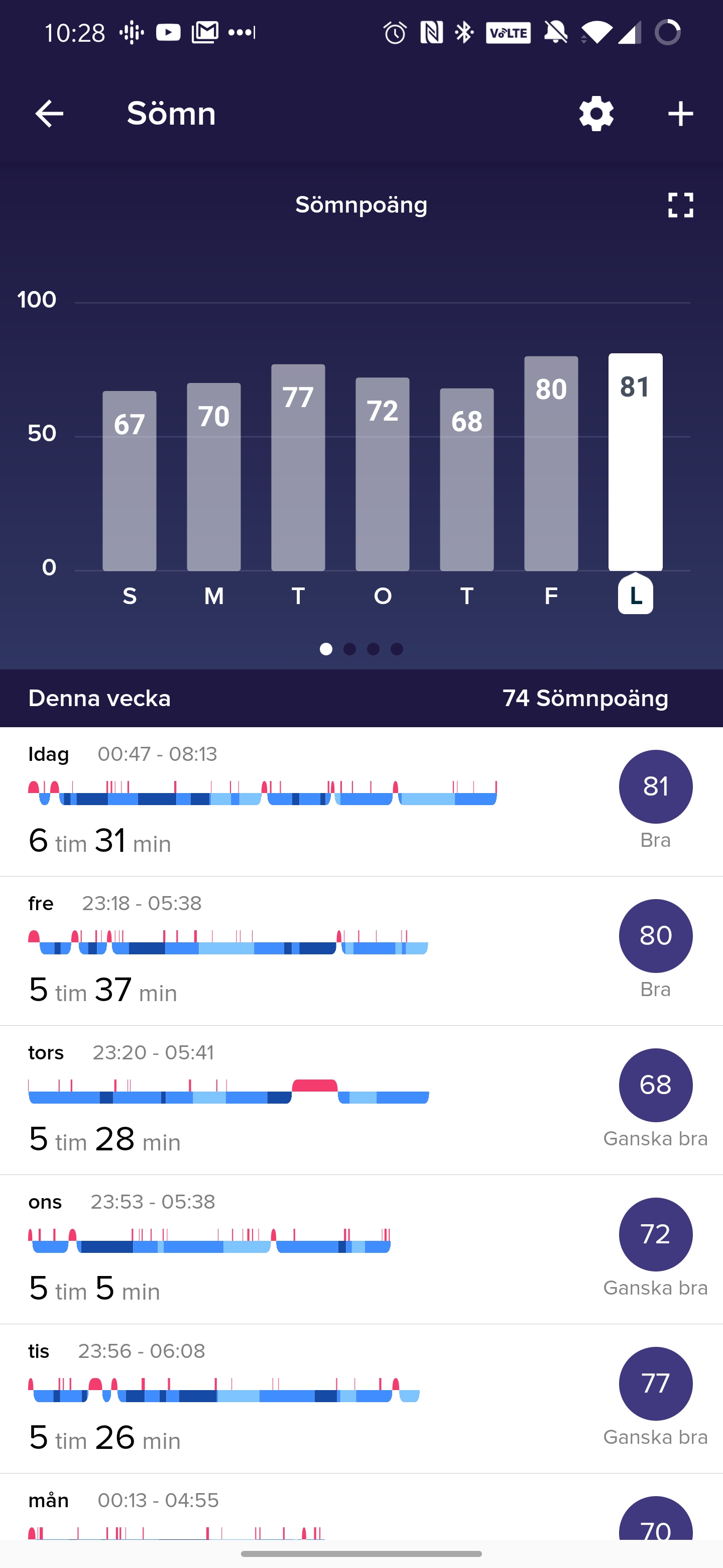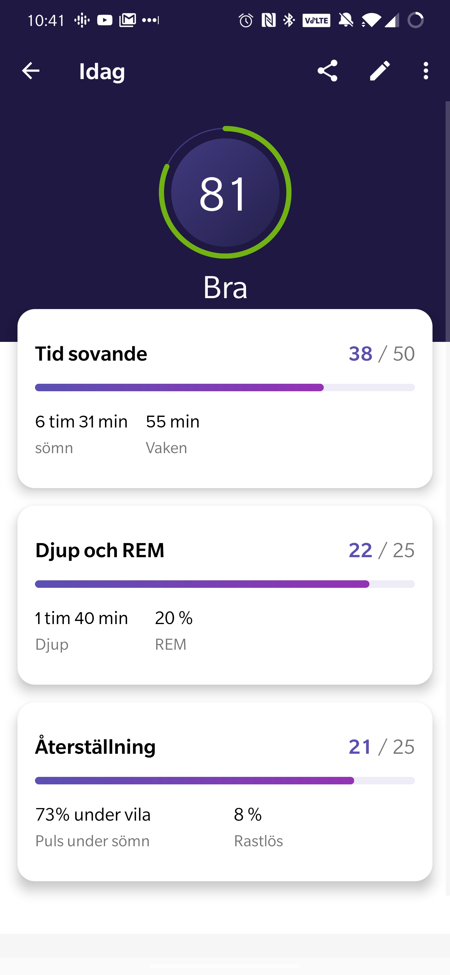Fitbit har länge prisats för sin sömnmätning, som mäter nattsömn med hjälp av användarens rörelse och puls. Dessa mätningar är svåra att validera men vi kan konstatera att klockan snabbt reagerar på insomning och när vi vaknar. Sömn mäts dock inte på kortare intervaller än minst en timme, vilket utesluter de flesta tupplurar. Baserat på sovande tid, vaken tid och de tre sömnstadierna lätt-, djup- och REM-sömn sammanställs nattsömnen i tydliga grafer. Vi noterar dock att Fitbit fortfarande mäter ovanligt många minuterlånga vakentider, som räknas in i den totala sovtiden. Fitbit beskriver korta uppvaknanden som något helt vanliga men dessa når ofta upp i totalt 45 till 55 minuter per natt. Bakom den nya tjänsten Fitbit Premium har tillverkaren designat en ny vy för sömnmätningar. Här ser vi en mer lättläst överblick av sömnkvalitet med en användarvänlig sömnpoäng och tydliga samband bakom hur detta värdet beräknas.