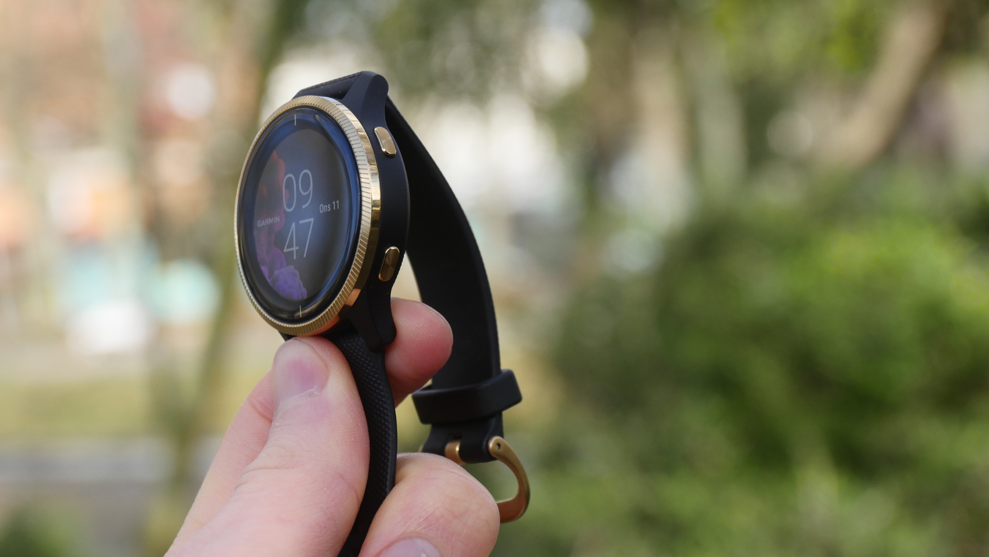 Den största skillnaden mellan Garmin Venu och Vivoactive-serien är just skärmen. Sedan tillverkarens första smartklockor har de använt sig av en så kallad transflektiv LCD-teknik som skapar ljusstyrka genom att spegla ljuset från omvärlden. Med den vanligare AMOLED-tekniken i Venu ser vi ett tydligt lyft i skärpa och kontrast från Vivoactive-klockorna. Garmin har inte snålat på skärmen. Likt både Samsung och Apple når den en maximal ljusstyrka på cirka 1 000 nits under vårt test. Det innebär att klockan är lätt att läsa i solljus, vilket är en fördel för en utomhusklocka. Med en skärmstorlek på 1,2 tum och en upplösning på 390 x 390, erbjuder Venu också en behaglig pixeltäthet som till och med slår vissa stora konkurrenter, så som Samsungs Galaxy Watch. Skärmens ljusstyrka anpassar sig automatiskt efter omgivningen men vi noterar att den förblir lite för ljus i mörka miljöer, så som sovrum.