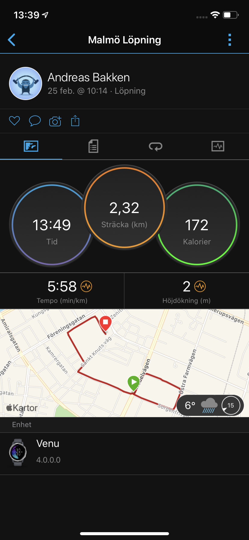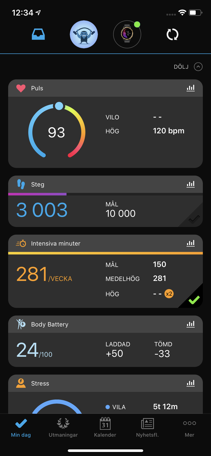Garmin har skapat Venu för en bred publik och den fungerar med både iOS- och Android-telefoner. För att parkoppla enheterna krävs appen Garmin Connect. Precis som för Fitbit och Huawei är detta en samlad app för både registrering av hälsa- och träningsvärden, såväl som klockans uppkoppling. Appen använder ett mörkt gränssnitt och listar dagens värden, gårdagens värden och en sammanfattning av de senaste sju dagarna. Den som vill ha en enkel överblick av aktivitet och hälsa får det på första skärmen, medan den som vill ha mer ingående information kan dyka ner i samtliga kategorier. Skillnaden mellan Android och iOS syns endast i hanteringen av notiser, där det inte går att svara på meddelanden för iOS-användare. I appen kan vi dyka in i en del av klockans inställningar men inte alla. Detta skapar tyvärr lätt förvirring för när man behöver använda klockans lite stökiga inställningar eller inte.
