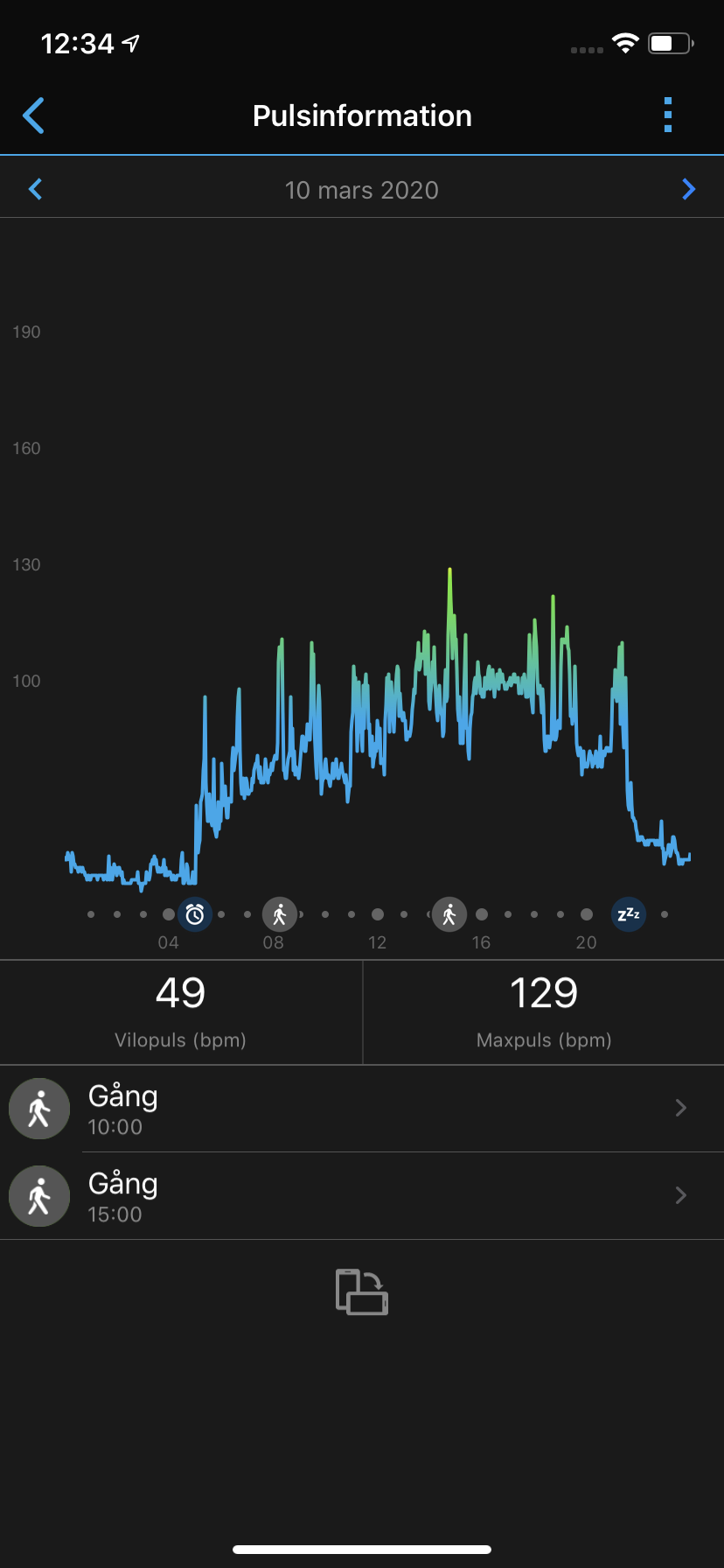 Garmin Venu mäter, som så många andra klockor, även nattsömn. Här ser vi resultat som baseras på rörelse, puls, andetag och SPO2. Med så många utgångspunkter är det lätt att anta att klockans sömnmätning i alla fall bör kunna matcha Fitbit Versa 2 eller Huawei Watch GT 2. Tyvärr ser vi under vårt test inga konsekventa resultat. Klockan lägger gärna till en timmes sömn om vi sitter stilla innan vi gick och la oss. Garmin Venu mäter sömn baserat på de tre stadierna lätt-, djup, och REM-sömn. Här ser vi att lättsömn får mest kärlek och att både djup- och REM-sömn ofta ligger i väldigt låga värden. Det kan vara så lågt som 15 till 20 minuter per natt, flera nätter i rad. Jämfört med Fitbit mäter Garmins sensorer betydligt färre vakna tillfällen och när den mäter att vi vaknar är det oftast tillfällen som vi kommer ihåg.