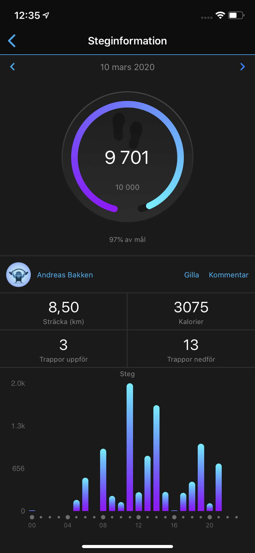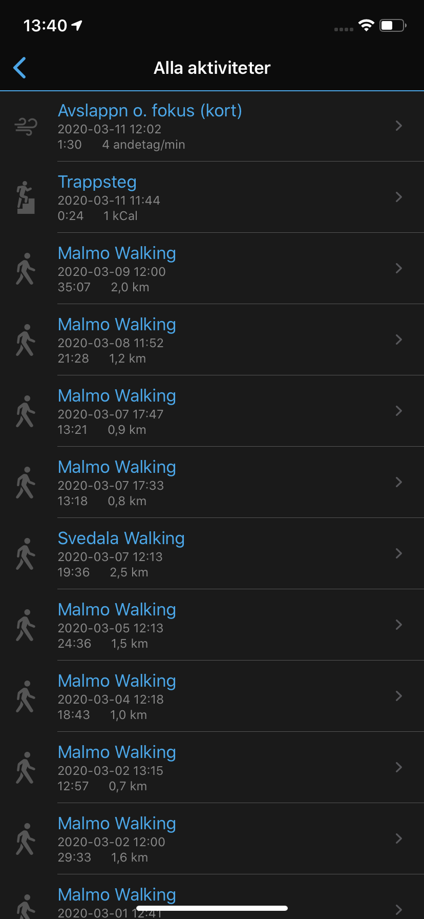 Garmin Venu är alltså en pålitlig stegräknare och en praktisk aktivitetsmätare. Förutom ovanstående aktivitetsmätning använder klockan även den inbyggda barometern för att räkna ökning, eller trappor. Som vanligt räknas en trappa som tre meter kontinuerlig höjd-ökning eller minskning. Till skillnad från andra klockor mäter Garmin Venu också när vi går nedför trappor. Här ser vi en förmåga att räkna trappor korrekt, både inomhus och utomhus. Samtidigt händer det dock att klockan låter bli att räkna trappor alls, vilket gör hela funktionen mindre pålitlig. Detta inträffar vid olycksfall även om vi manuellt aktiverar det som en träningsaktivitet, något som Garmin Vivoactive 4s inte hade problem med.