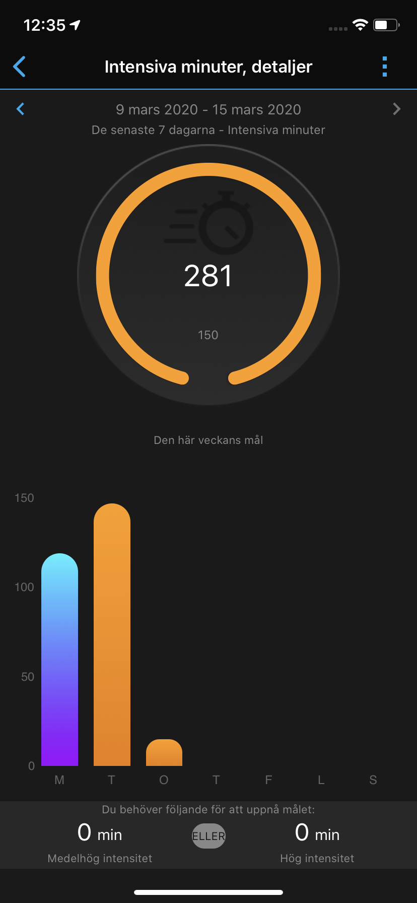 Något som Garmin snabbt stoltserar med är den inbyggda algoritm-mätningen MoveIQ. Detta är en funktion som i teorin låter som vilken automatisk aktivitetsmätning som helst, där klockan registrerar vad användaren gör och sparar det. I praktiken ser vi dock efter ungefär tio minuters gång att klockan inte bara räknar steg och tid utan även avstånd. När promenaden är klar får vi också en karta över vart vi gått, pulsmätning och kaloriförbränning. Detta är särskilt imponerande eftersom Garmin Venu bara räknar ett ynka steg för mycket under ett stegräkningstest på 500 steg. Samtliga aktiviteter under dagen sparas i appen och bidrar till det som kallas för Intensiva minuter. Här sammanställs aktivitet som antingen medelhög eller hög intensitet och räknas mot ett förinställt veckomål. Klockan vibrerar varje gång målet nås och ännu fler gånger om vi överskrider målet med en enkel men uppskattad animation.