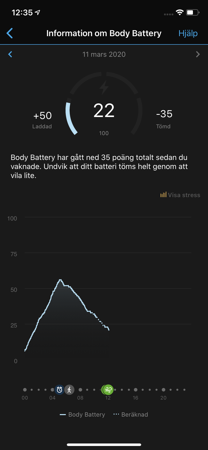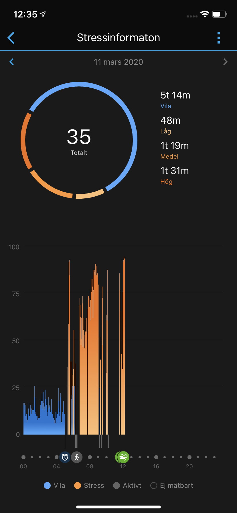 Garmin kan också mäta stressvärden under dagen. Klockan vibrerar om den anser att användaren är stressad vid vissa tillfällen och rekommendera en paus och andningsövning. Tyvärr ser vi att klockan ofta vibrerar och meddelar att vi verkar lite stressade, trots att vi inte alls uppfattar det så. Om det beror på personlig förnekelse är svårt att ge bevis för. Precis som på andra smartklockor har vi i alla fall svårt att rekommendera klockan för just stressmätning.