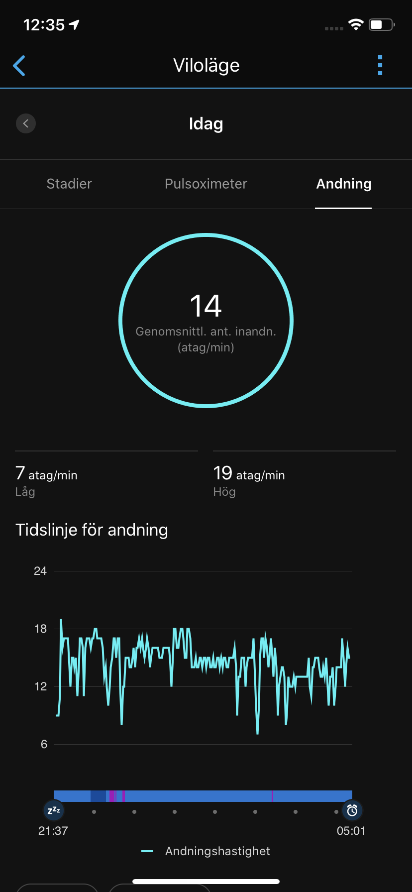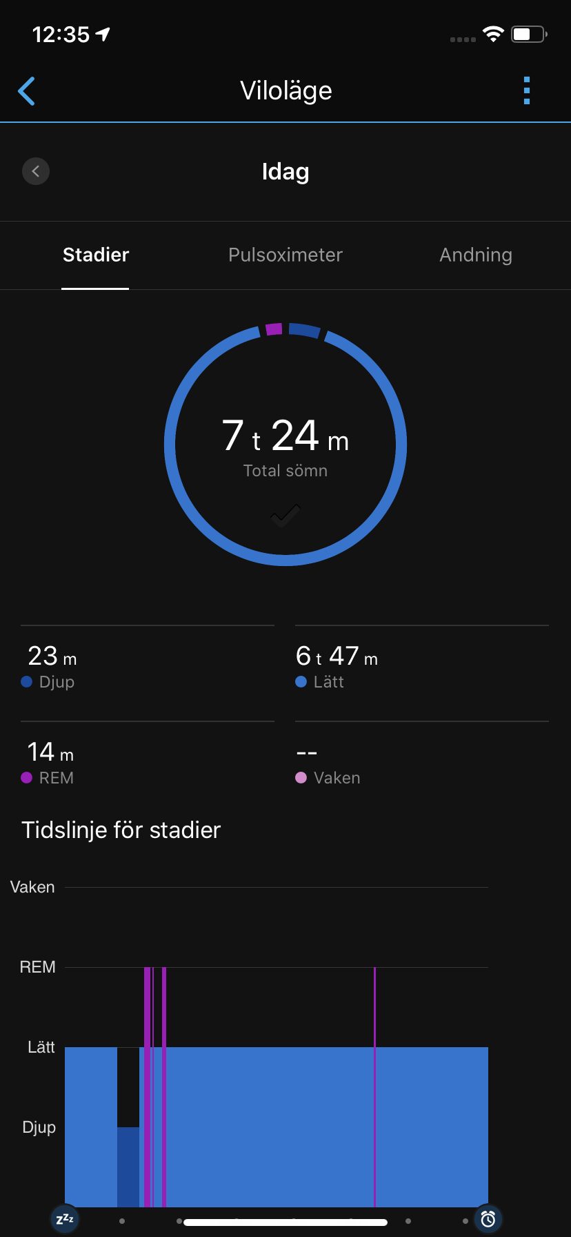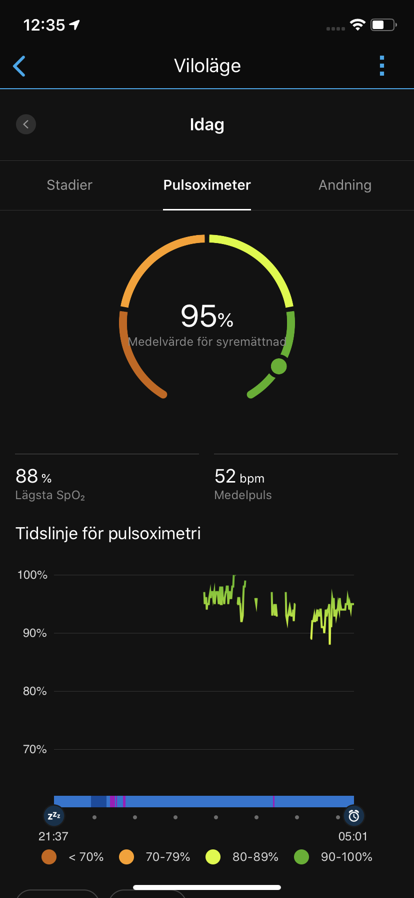 Hur korrekt en sömnmätning är är svårt att validera. Vi kan dock konstatera att Garmin Venu ser ut att missa stadier, samt att den ibland lägger till tid redan innan vi lagt oss. I och med Pulsoxymeter-sensorn kan Venu även redovisa blodets syressättning under nattsömnen. Här ser vi ofta ett värde på 95 procent, vilket är logiskt, baserat på dagsvärdet 98 procent. Pulsoxymeter minskar ofta på natten då vi andas mindre. Även antal andetag per minut är ett välkommet värde som ger sömnmätningen pluspoäng, men även det är svårt att validera. Den som verkligen vill fokusera på sömnmätning bör titta efter andra smartklockor.