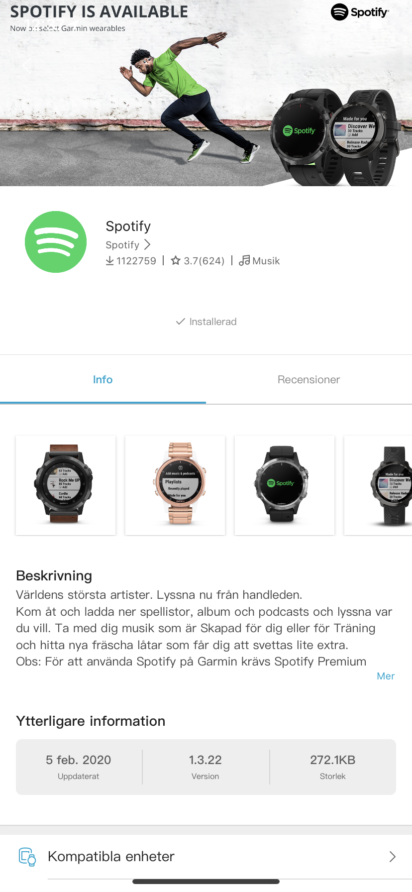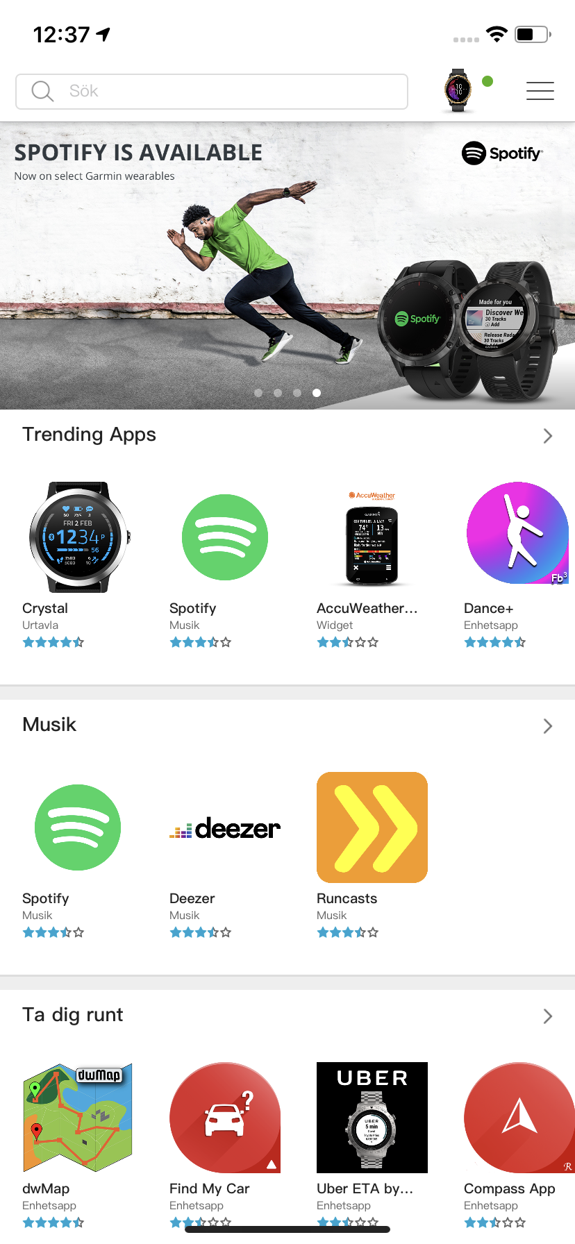 En stor fördel som Garmin har är att det är busenkelt att parkoppla Venu med flera telefoner samtidigt. Det är positivt för den som byter telefon ofta eller vill ha notiser från jobbtelefonen på dagtid. Connect IQ, som är Garmins appbutik, är lättnavigerad och bjuder på kategorier att bläddra i. Det är enkelt nog att installera appar och varje app har en beskrivning samt utrymme för användarrecensioner. Likt Fitbit har Garmin inte valt att skapa ett system för betalningar i appbutiken. Detta innebär att det inte alltid är uppenbart om en app har betalningsalternativ. Detta har lett till att tillverkare har skapat egna lösningar för premiumfunktioner.