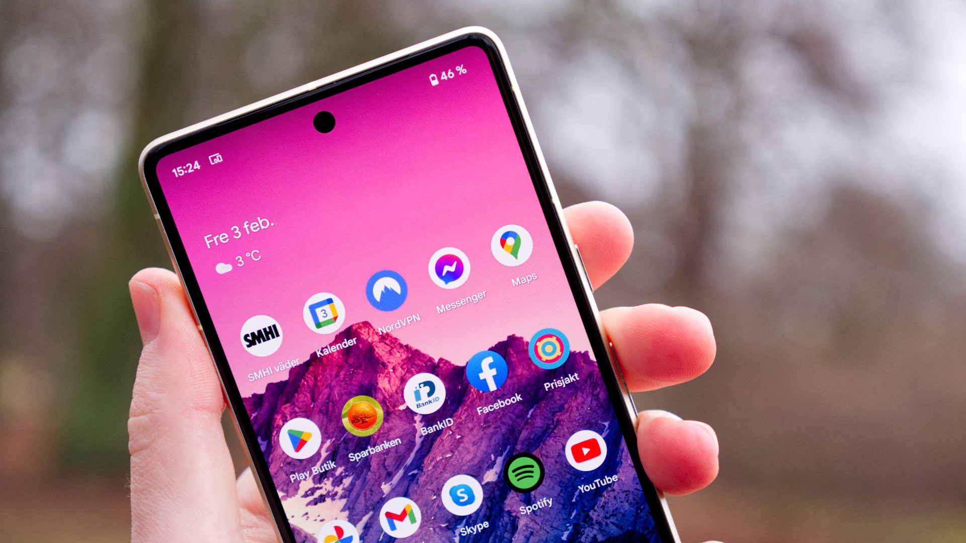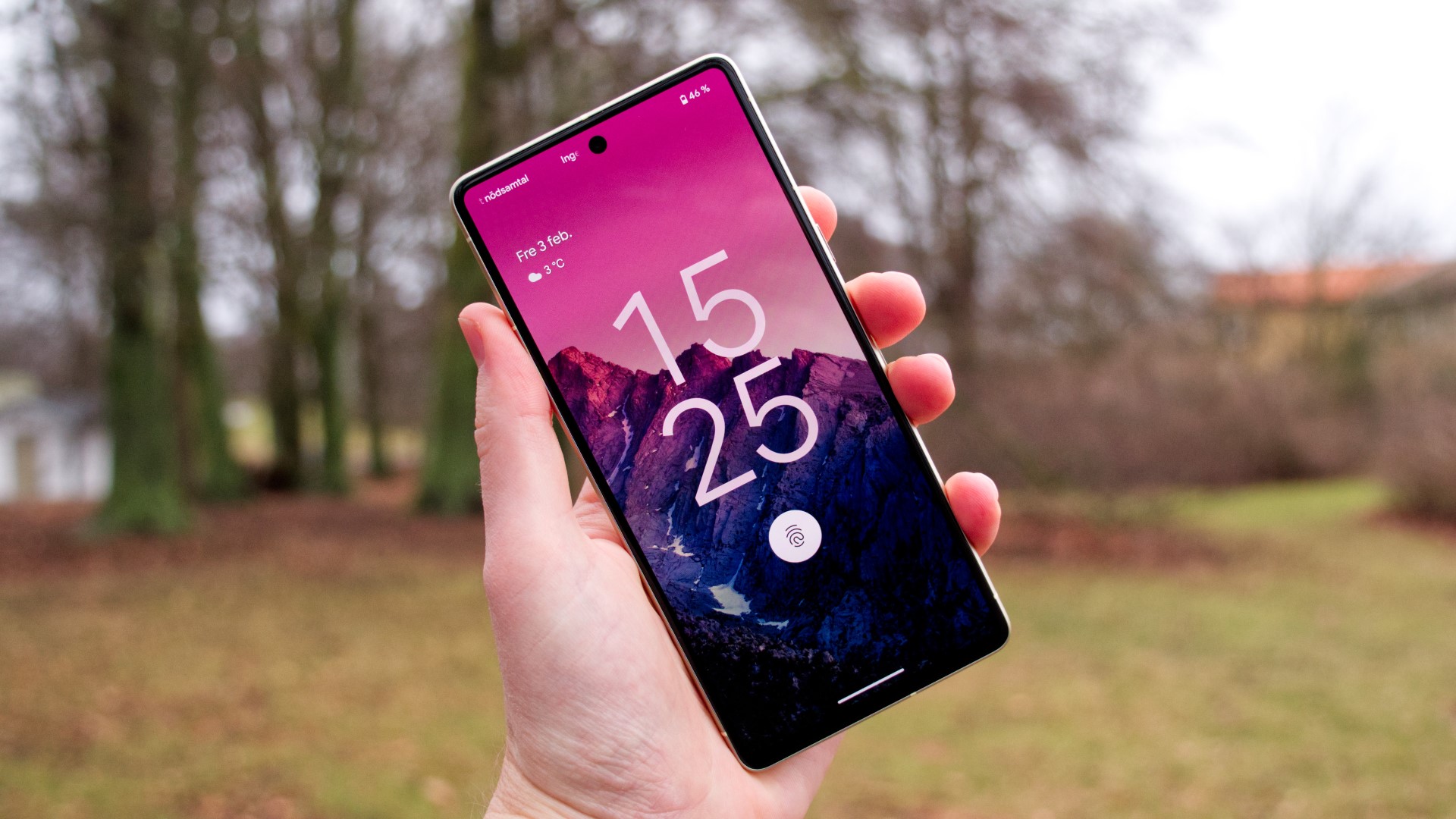 Framsidan av Pixel 7 har en anonym och enkel design på sin framsida. Kameran har ett eget litet hål i skärmen och under skärmen finns en fingeravtrycksläsare som fungerar snabbt och pålitligt.