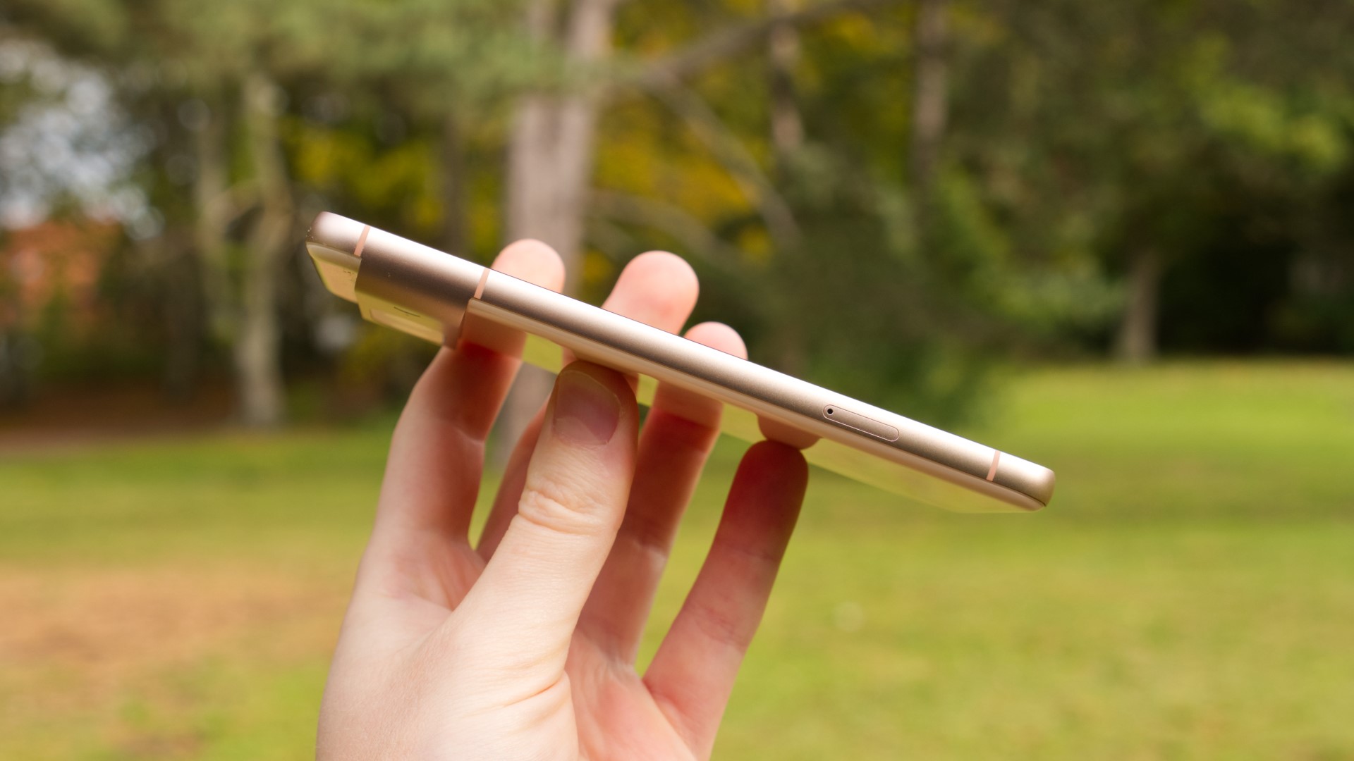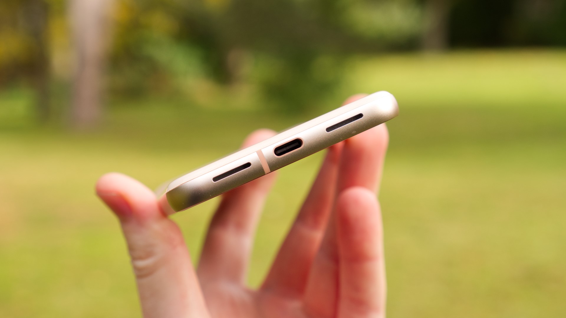 Baksidan är gjord av glas och är därmed reptålig men kan spricka om telefonen tappas. Glaset ger en känsla av kvalitet som stärks av en bred och stadig metallram, som för övrigt är samma metalldel som kameramodulen skyddas av. Längs höger sida finns en på/av-knapp och volymkontroller som ger bra fysisk återkoppling. Längs vänster sida finns en kortläsare med plats för ett nanoSIM-kort. Utöver det går det att installera ett virtuellt eSIM i telefonen.