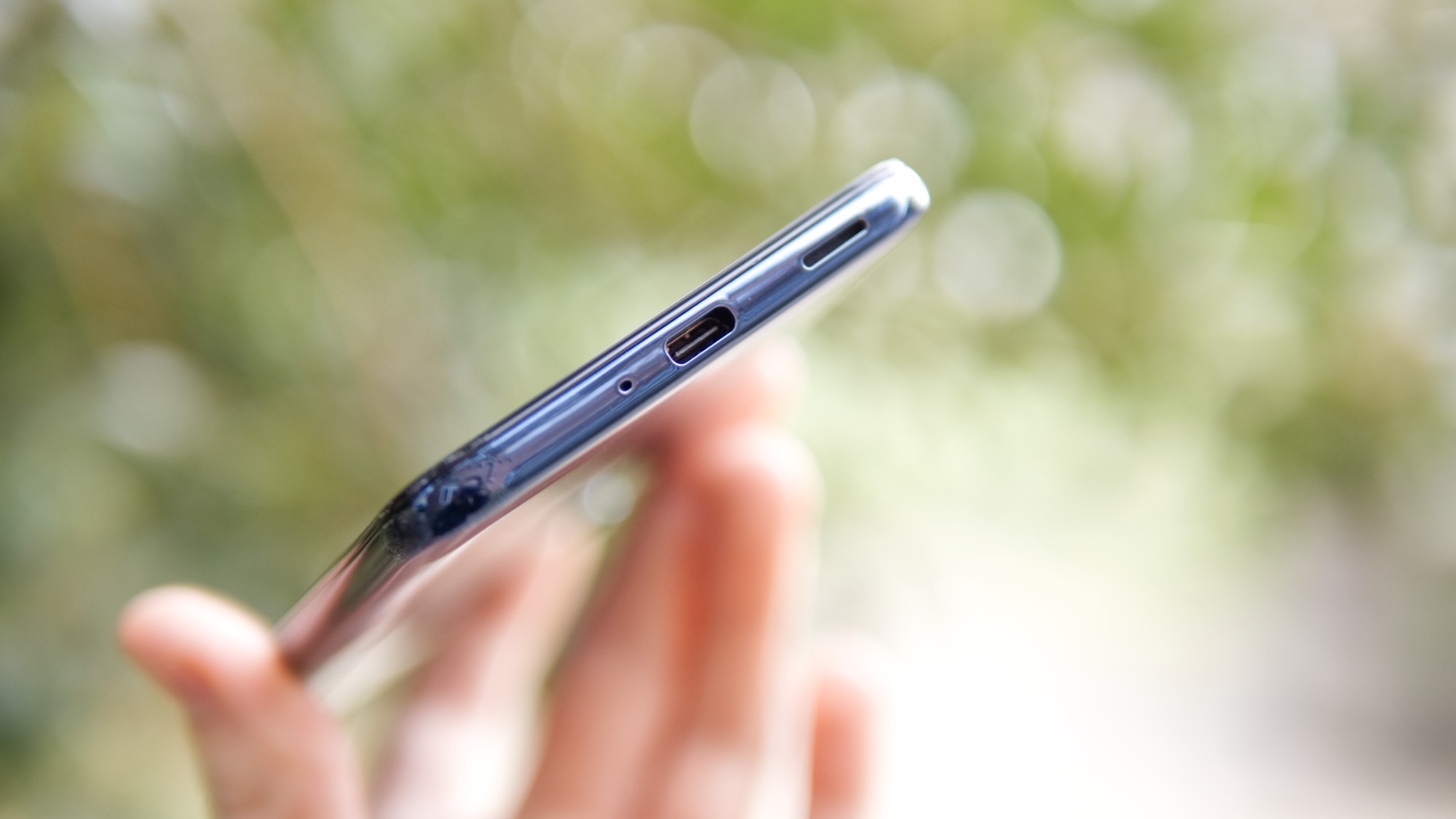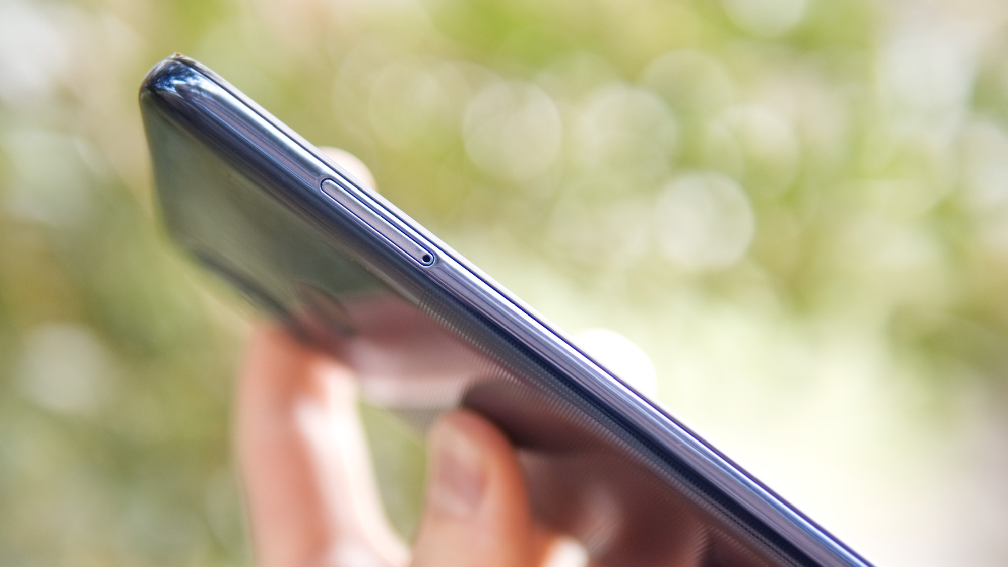 Längs höger sida finns en på/av-knapp och två volymknappar. På/av-knappen har ett tydligt mönster som gör den lätt att känna med fingret. Knappen ger dock ganska medioker fysisk återkoppling. Den känns svampig och ger inte den feedback som vi hade önskat. På andra sidan av knappen finns i alla fall en kortläsare. Läsaren har plats för två nanoSIM-kort eller ett nanoSIM- och ett microSD-kort. Det får alltså plats maximalt två kort samtidigt.
