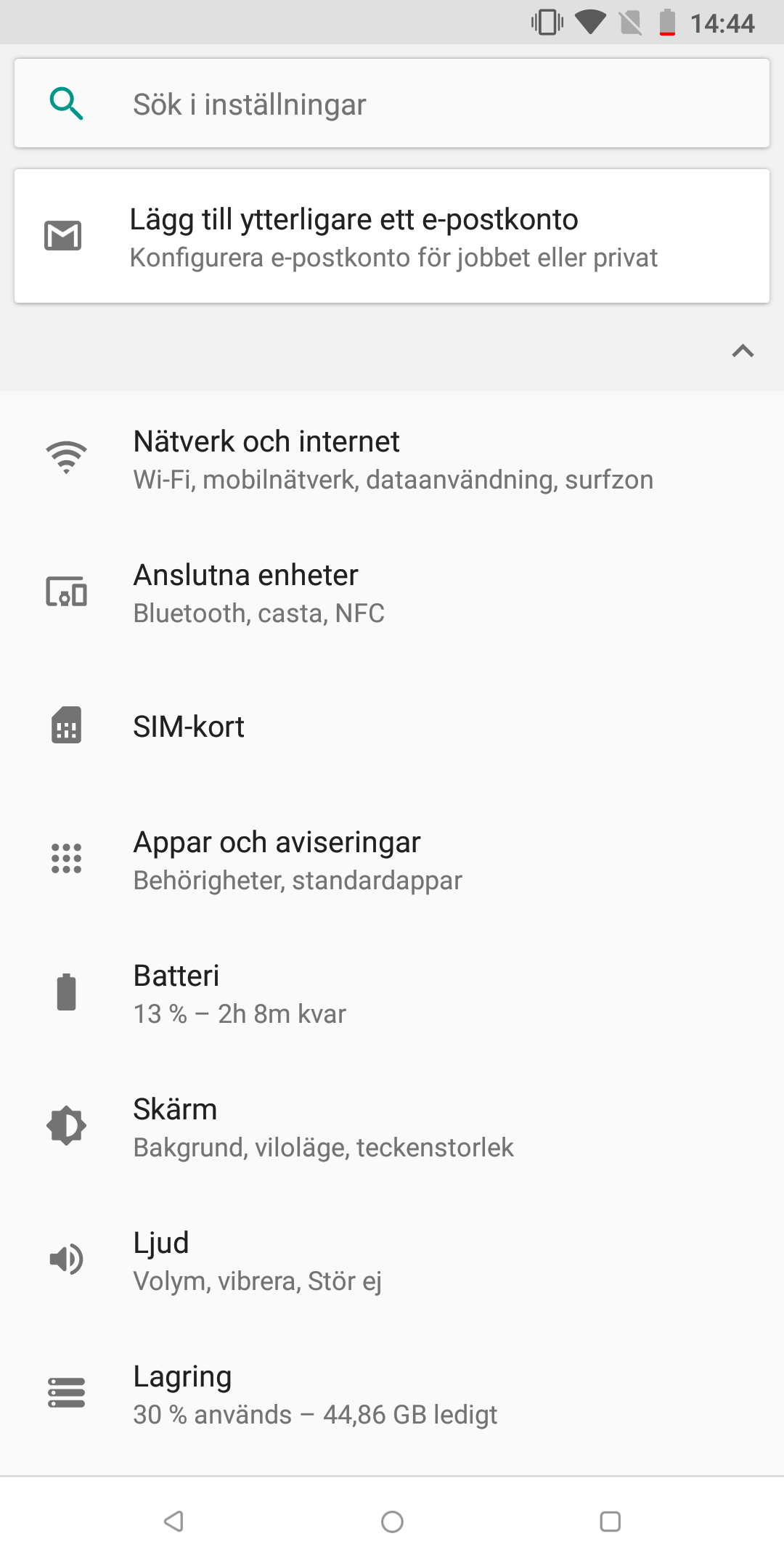 Läs mer om mjukvaranHTC U12 Life använder Android 8.1. Vi har testat den med en uppdatering från augusti 2018. Ovanpå operativsystemet ligger HTC Sense som förändrar stora delar av operativsystemet men låter andra delar vara så gott som oförändrade. Hemskärmen har till exempel flera anpassningar och ett HTC-unikt utseende men många systemmenyer ser så gott oförändrade ut. För den som vill ha en mer ”ren” användarupplevelse räcker det att ersätta den så kallade launchern som styr hem- och appskärmen. HTC har visserligen lagt till ett fåtal andra extrafunktioner men med en annan launcher är de svåra att hitta.
