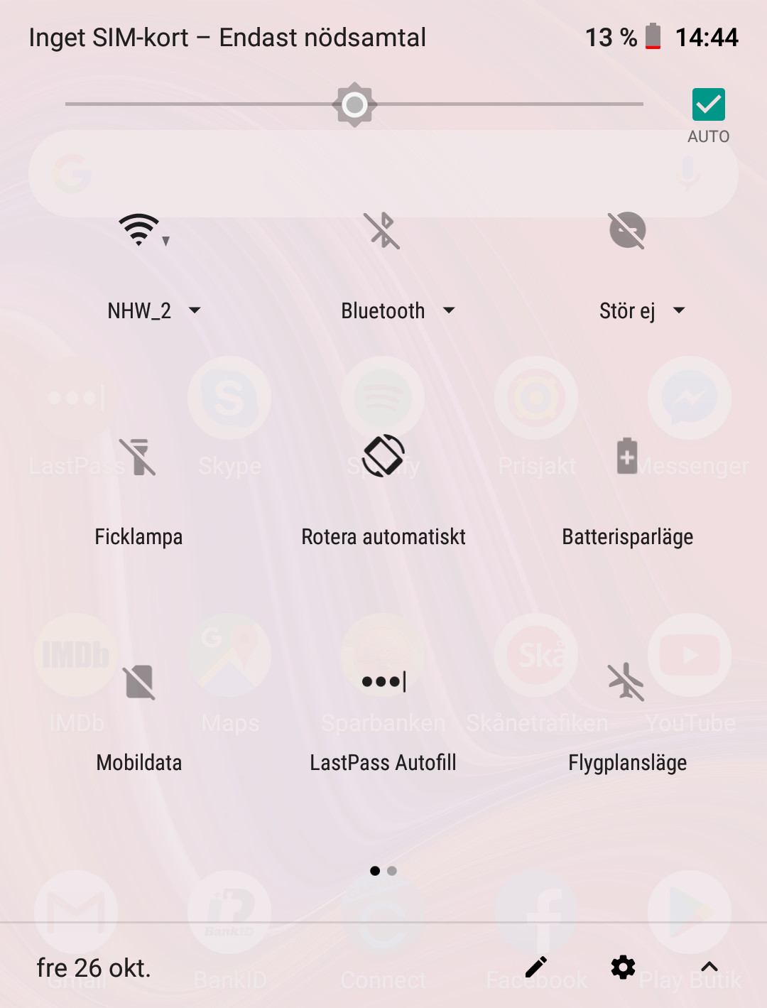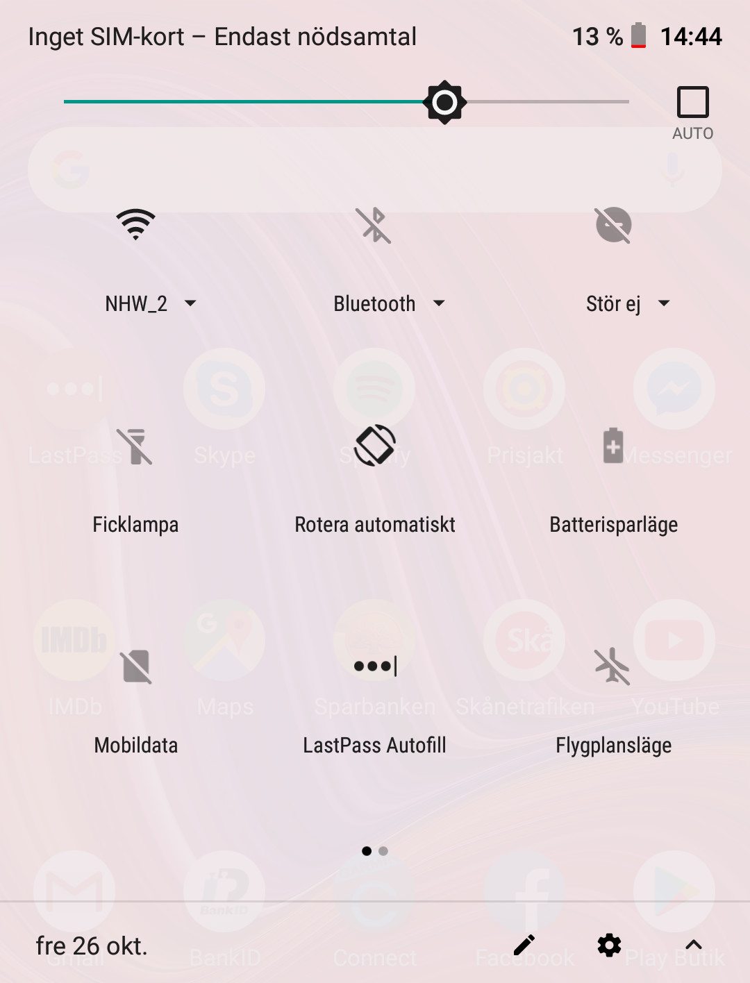 En av få systemförändringar som HTC har gjort i U12 Life har med skärmen att göra. Förändringen är mest uppenbar när vi drar ner snabbgenvägarna från toppen av skärmen. Här finns ett reglage för att justera skärmens ljusstyrka. Det finns ett manuellt reglage och en Auto-knapp. I Android finns det vanligen inget reglage för att aktivera skärmens autoläge. Reglaget styr vanligen ljusstyrkan oberoende på om skärmen ligger i manuellt läge eller autoläge. När telefonen justerar skärmens ljusstyrka automatiskt kan användaren ändå justera skärmen när det behövs. Så är det inte med U12 Life. Användaren får helt enkelt antingen ha Auto-läget aktiverat eller justera skärmen helt manuellt. Det är minst sagt opraktiskt. Det gör nämligen att vi behöver komma ihåg att manuellt aktivera Auto-läget vid tillfällen då vi vill justera skärmens ljusstyrka under en kortare stund.
